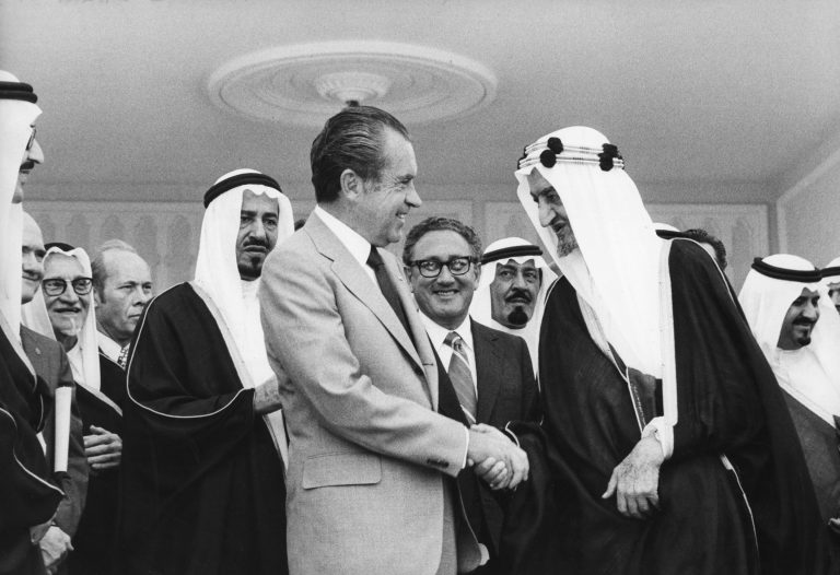 1974年,美國總統(tǒng)尼克松派國務(wù)卿基辛格前往沙特阿拉伯,敲定了一份秘密協(xié)議。此前三年,也就是1971年8月,尼克松在一次電視講話中宣布將讓美元與黃金脫鉤,從而終結(jié)了二戰(zhàn)以來支撐全球金融體系的布雷頓森林體系,一夜之間重塑了全球主要貨幣格局。到1973年,布雷頓森林體系已經(jīng)徹底瓦解。