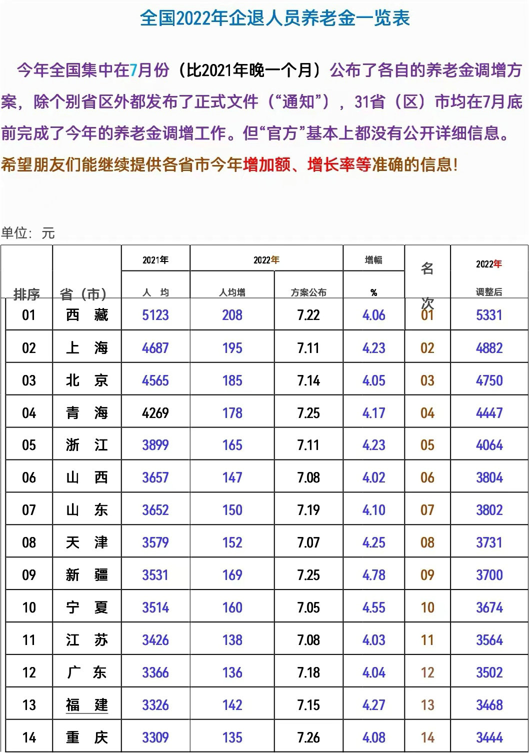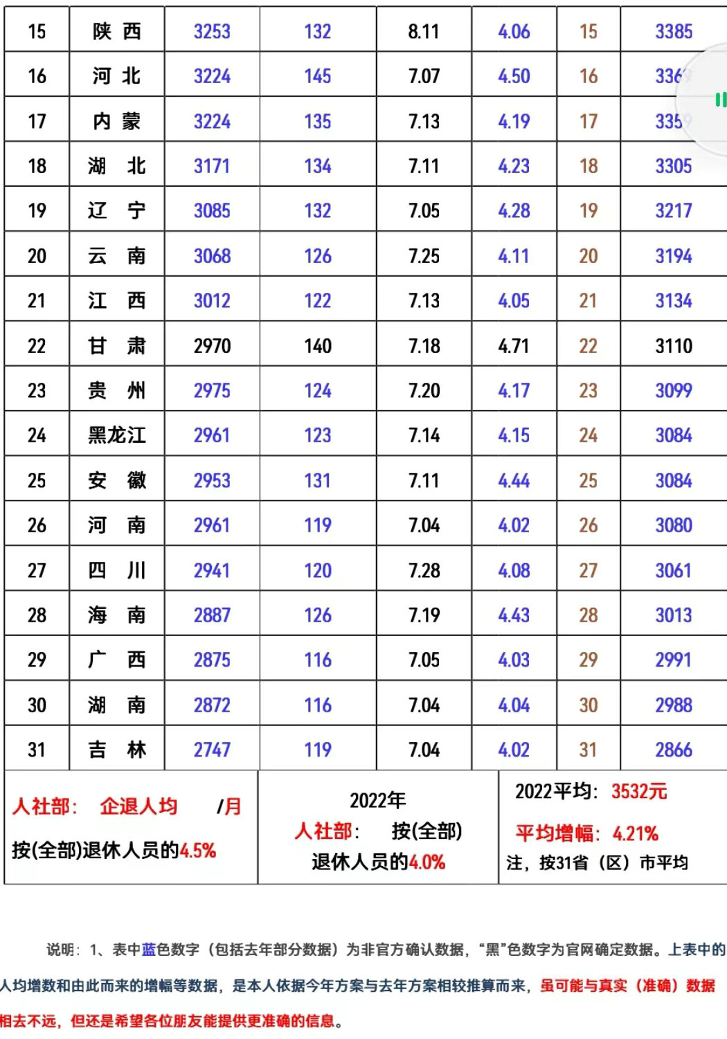 2022年全國各地區(qū)退休人員基本養(yǎng)老金調(diào)整后人均估算表