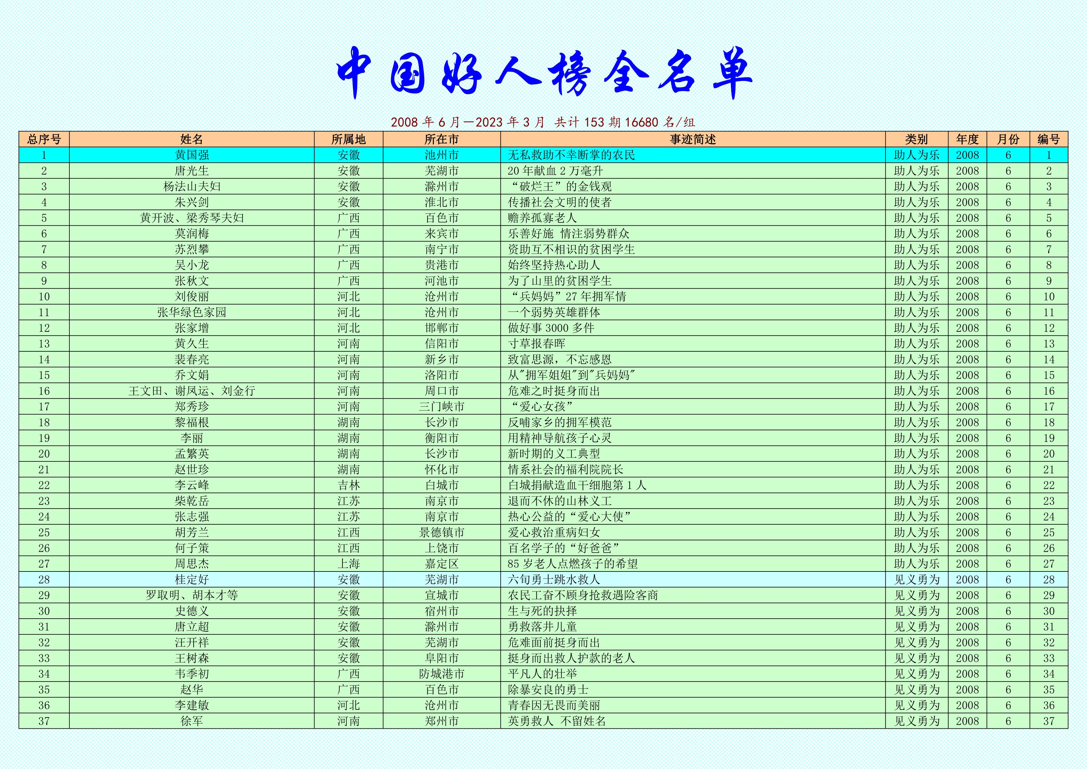 新華社鄭州6月21日電(記者韓朝陽)6月21日,2023年第一季度“中國好人榜”發布儀式暨全國道德模范與身邊好人現場交流活動在河南省洛陽市舉辦。經各地推薦、網友點贊評議和專家評審等環節,共有150人(組)助人為樂、見義勇為、誠實守信、敬業奉獻、孝老愛親身邊好人光榮上榜。