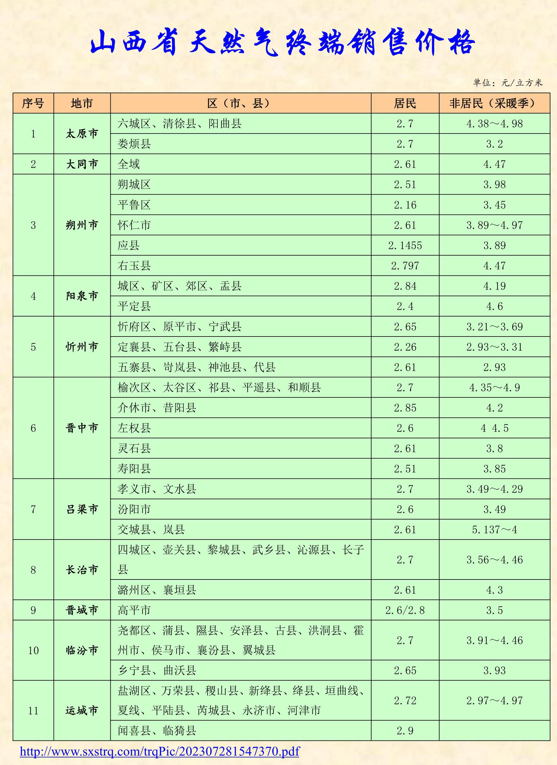 太原市居民用天然氣銷售價格表