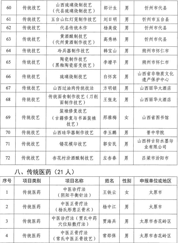 進入第六批省級非物質文化遺產代表性項目代表性傳承人名單的傳承人共318名,其中,傳統音樂類包括太原鑼鼓張愛仙、上黨八音會衛鵬飛等27人,傳統舞蹈類包括渾源耍故事郭青松、左權小花戲韓永青等23人,傳統戲劇類包括晉劇閆耀、靈丘羅羅腔安文國等55人,曲藝類包括壺關鼓書王里蘭、陵川鋼板書靳文蓮等13人,傳統體育、游藝與雜技類包括大同梅花拳賈鈺、文水長拳左雙牛等15人,傳統美術類包括廣靈染色剪紙張棟。平遙木版年畫鄧曉華等92人,傳統技藝類包括晉作家具制作技藝崔躍、平定紫砂制作技藝李偉等72人,傳統醫藥類包括太原楊氏形意正骨術楊中江、大同泉派中醫療法李亮等21人。