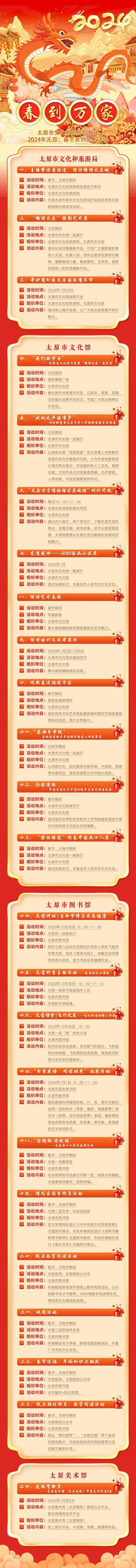本報訊(記者 陳辛華)2024年元旦、春節(jié)將至,太原市文化和旅游局聯(lián)合各縣(市、區(qū))文旅系統(tǒng)推出“春到萬家”元旦、春節(jié)系列文化活動,共133項,豐富節(jié)日期間群眾精神文化生活,營造歡樂吉祥、溫暖和順的濃厚節(jié)日氛圍。