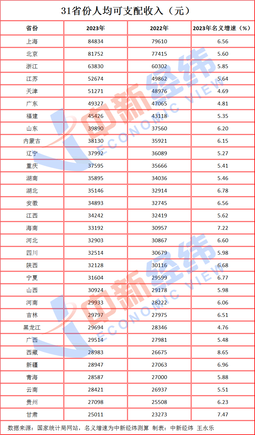 中新經(jīng)緯1月20日電 (王永樂)2023年31省份人均收入榜出爐。國家統(tǒng)計局19日公布的2023年居民人均可支配收入數(shù)據(jù)顯示,上海、北京、浙江穩(wěn)居前三,上海和北京更是攜手首超8萬元;西藏名義增速最高。你家鄉(xiāng)排第幾?