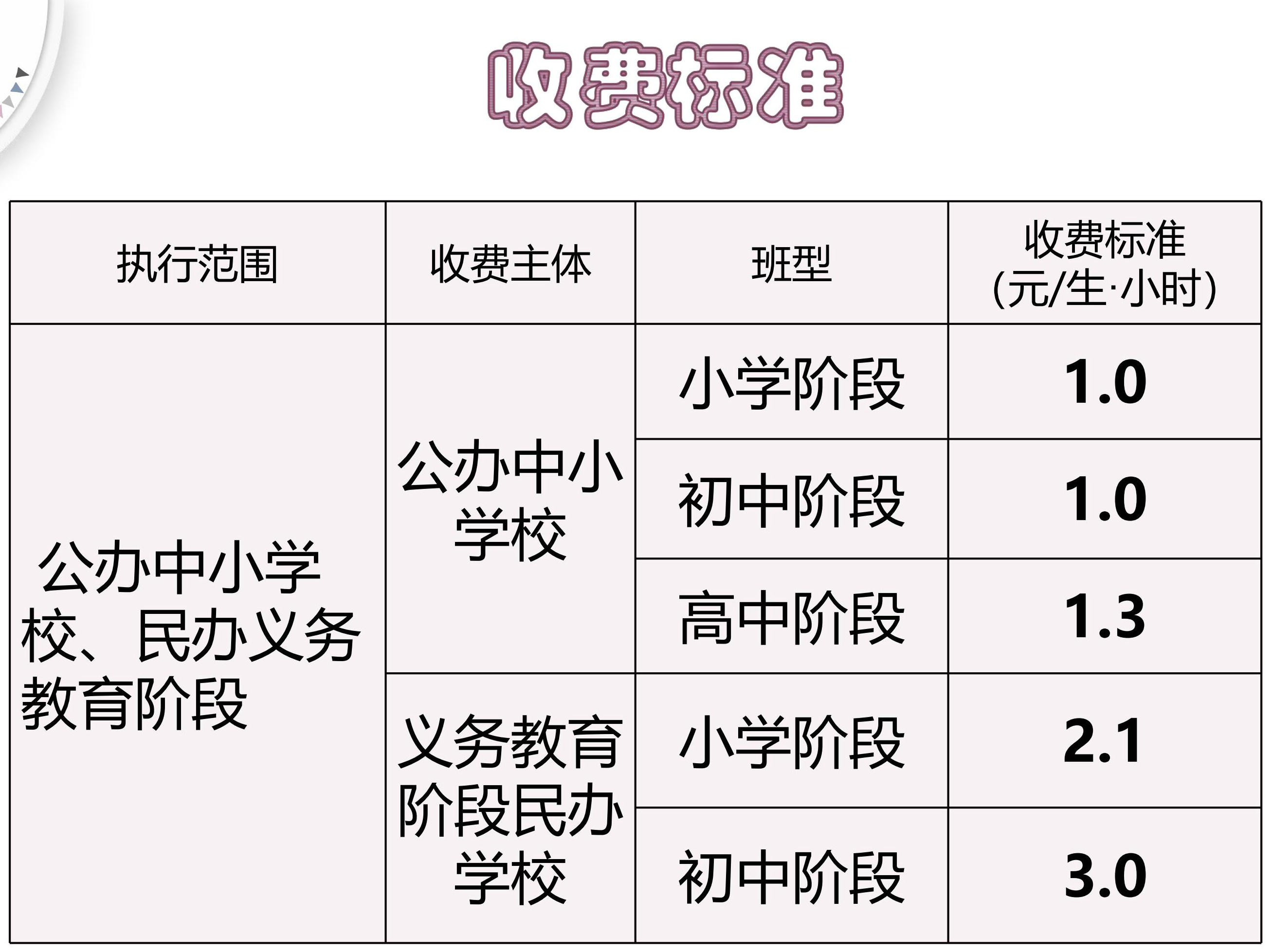 中小學生課后服務收費屬于服務性收費,按學期由學校向學生收取。收費時應使用稅務機關監制的稅務發票。學校要嚴格執行收費公示制度,將課后服務收費標準、服務時間、課程內容等相關信息公開,主動接受學生、家長和社會監督。