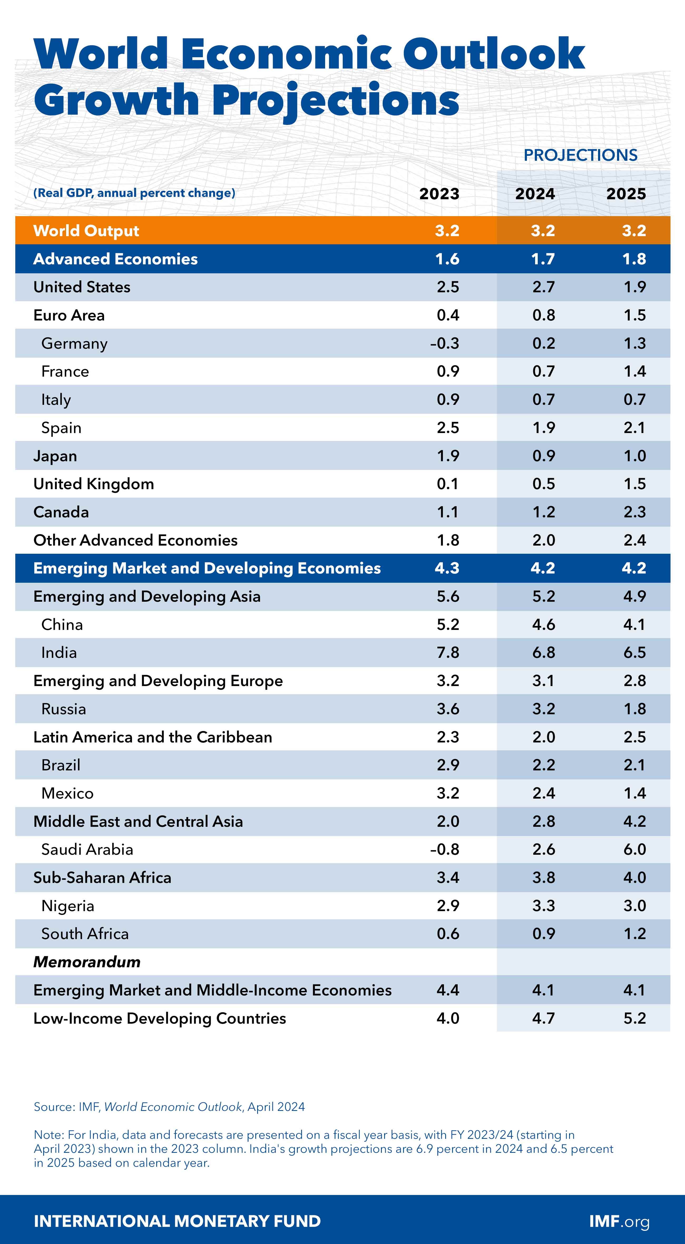 盡管取得了這些進(jìn)展,但大多數(shù)經(jīng)濟(jì)體的通脹仍未達(dá)到目標(biāo),且存在嚴(yán)重分化。IMF表示,發(fā)達(dá)經(jīng)濟(jì)體的通脹率將先于新興市場(chǎng)和發(fā)展中經(jīng)濟(jì)體下降,即在2024年進(jìn)一步下降2個(gè)百分點(diǎn),并更快恢復(fù)到接近疫情前平均水平,2025年通脹率平均為2.0%。大約一年后,新興市場(chǎng)和發(fā)展中經(jīng)濟(jì)體預(yù)計(jì)也將恢復(fù)到接近5.0%的疫情前平均水平。