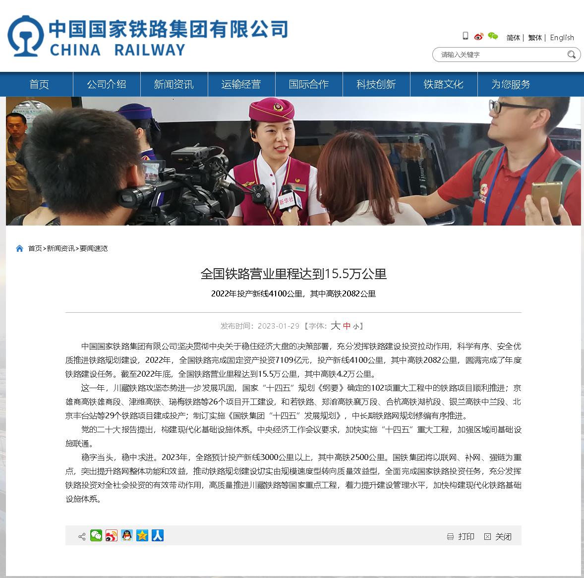 中新網1月29日電 據中國國家鐵路集團有限公司網站消息,2022年,全國鐵路完成固定資產投資7109億元,投產新線4100公里,其中高鐵2082公里,圓滿完成了年度鐵路建設任務。截至2022年底,全國鐵路營業里程達到15.5萬公里,其中高鐵4.2萬公里。