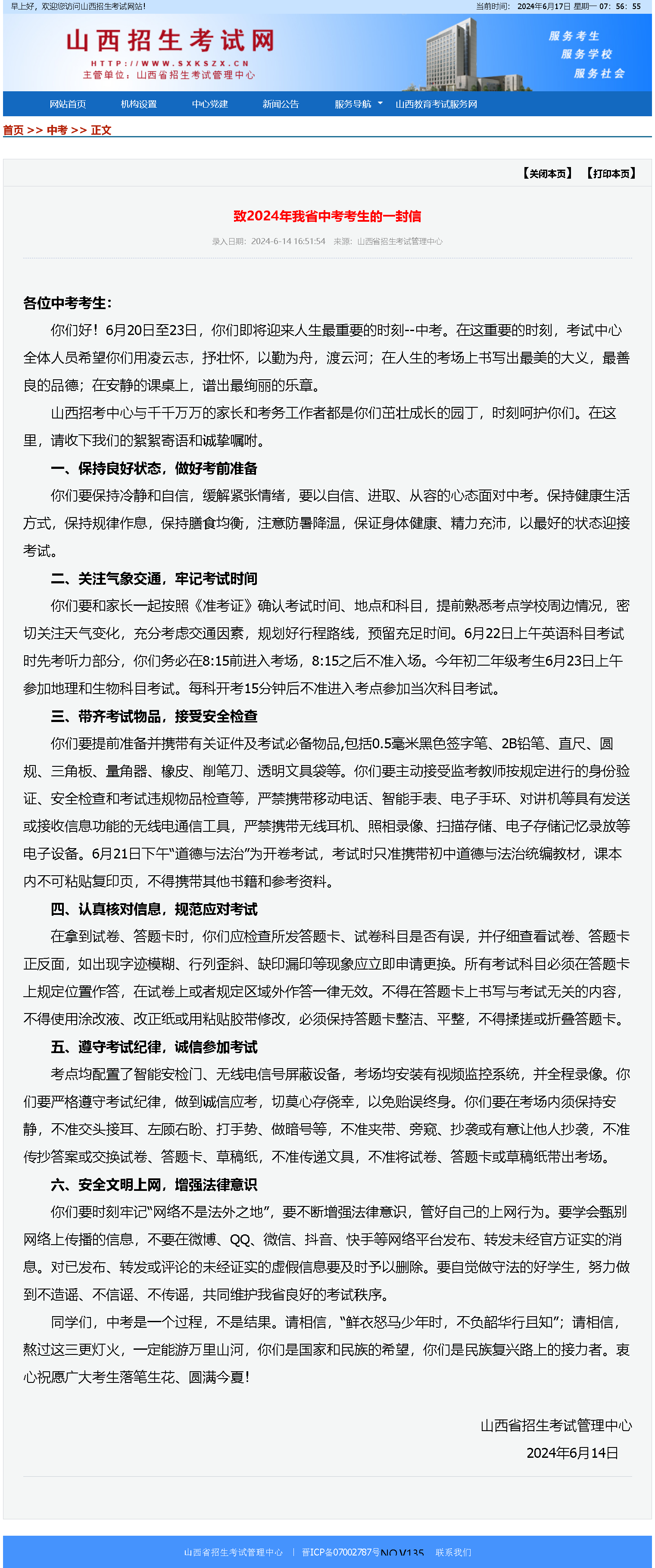 黃河新聞網訊(記者周昱麗)6月14日,山西省招考中心發布《致2024年我省中考考生的一封信》。節選如下: