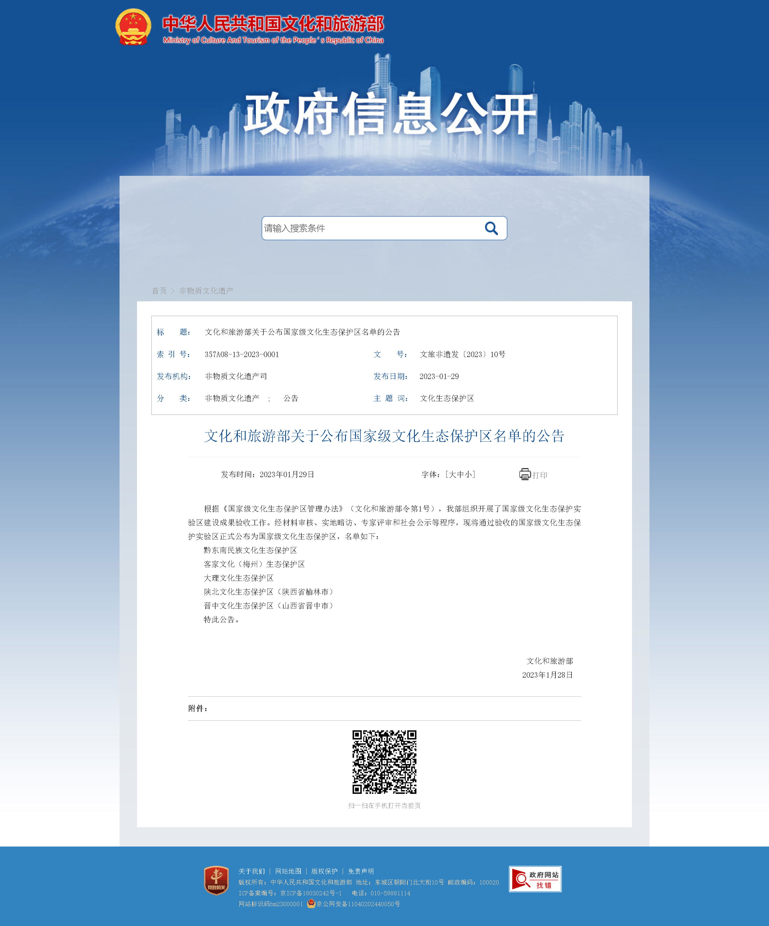經(jīng)材料審核、實(shí)地暗訪、專家評(píng)審和社會(huì)公示等程序,文化和旅游部將通過(guò)驗(yàn)收的國(guó)家級(jí)文化生態(tài)保護(hù)實(shí)驗(yàn)區(qū)正式公布為國(guó)家級(jí)文化生態(tài)保護(hù)區(qū),它們是:黔東南民族文化生態(tài)保護(hù)區(qū)、客家文化(梅州)生態(tài)保護(hù)區(qū)、大理文化生態(tài)保護(hù)區(qū)、陜北文化生態(tài)保護(hù)區(qū)(陜西省榆林市)、晉中文化生態(tài)保護(hù)區(qū)(山西省晉中市)。