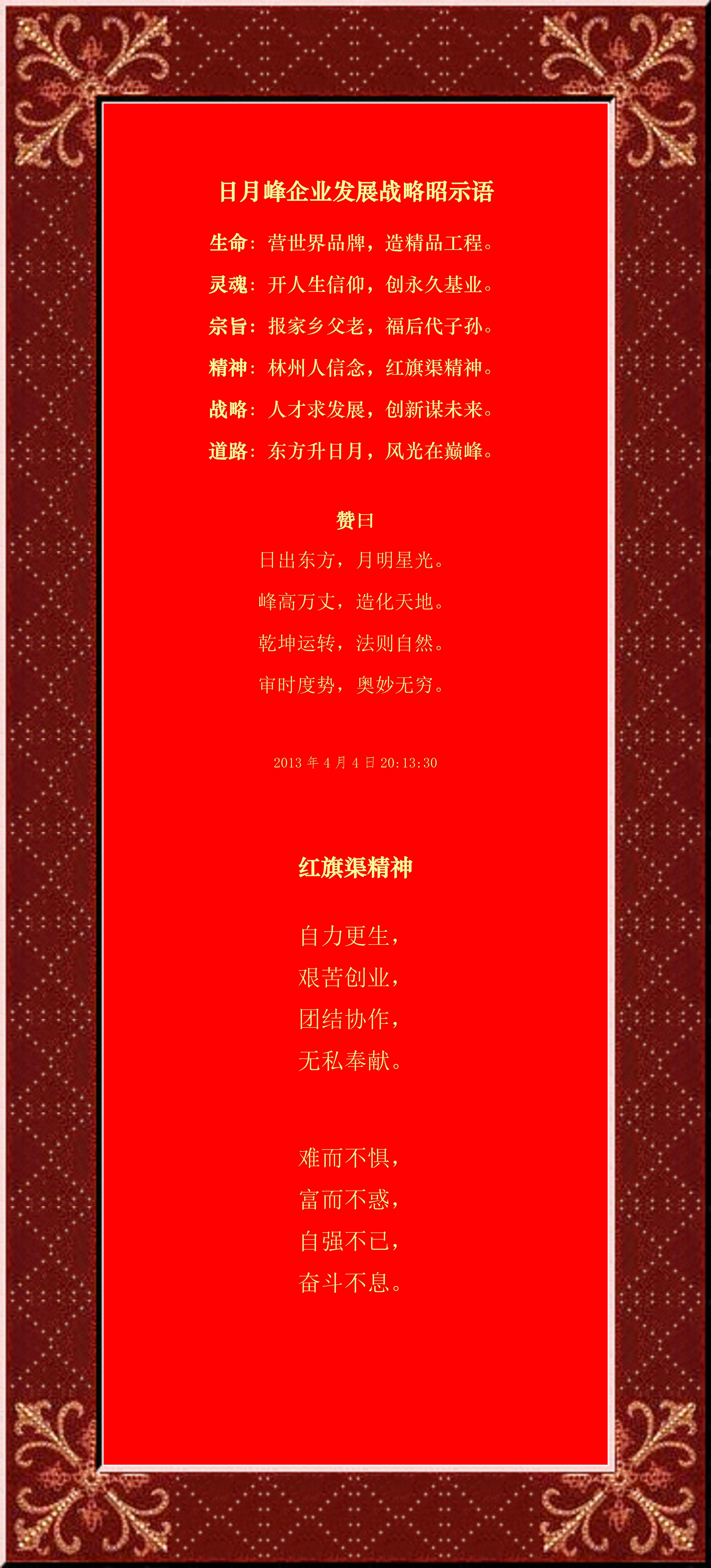 這是十二年前給日月峰制定的公司發(fā)展戰(zhàn)略昭示語,發(fā)表在山西日月峰建筑工程有限公司網(wǎng)站企業(yè)文化欄目上。