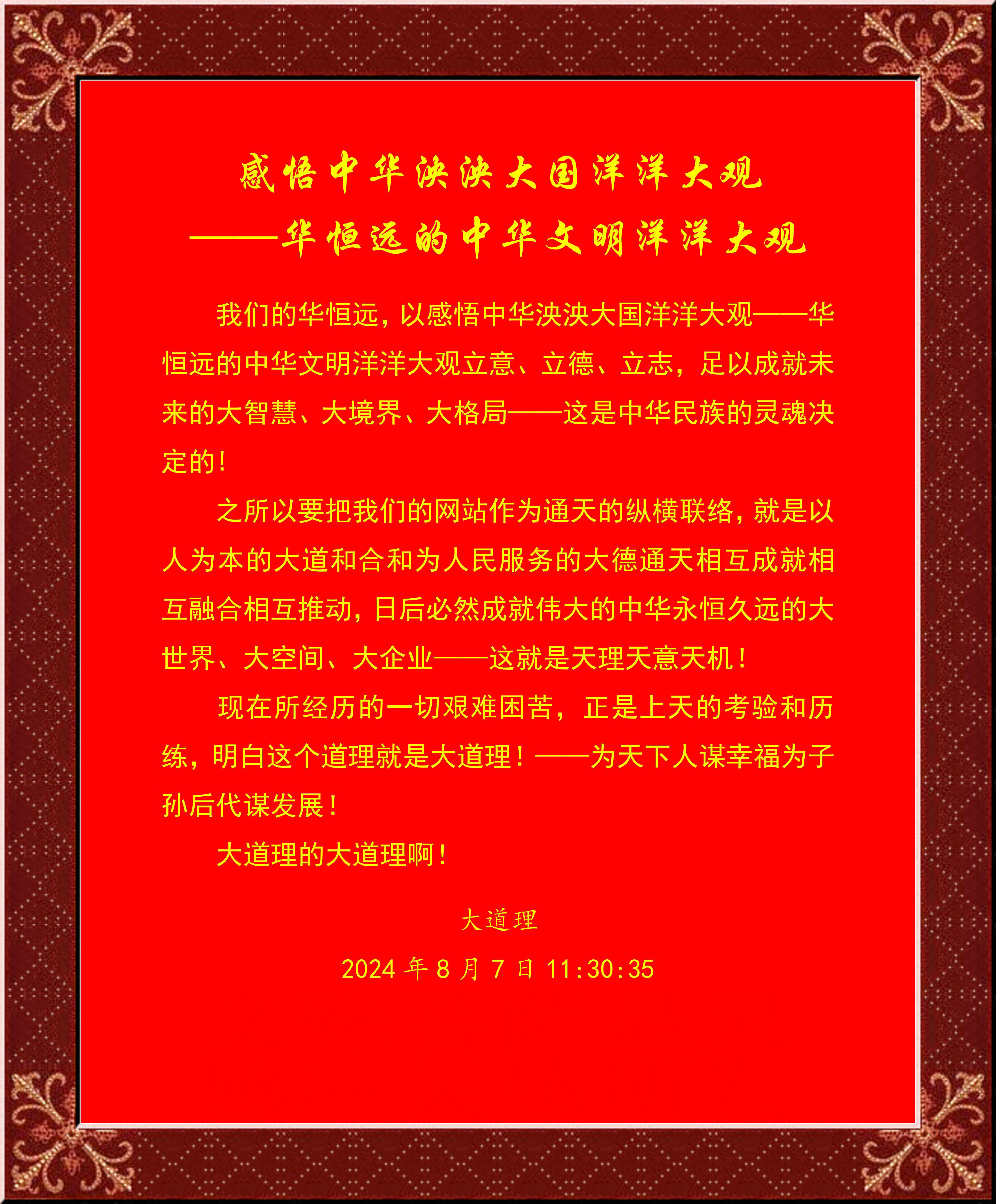 我們的華恒遠,以感悟中華泱泱大國洋洋大觀——華恒遠的中華文明洋洋大觀立意、立德、立志,足以成就未來的大智慧、大境界、大格局——這是中華民族的靈魂決定的!