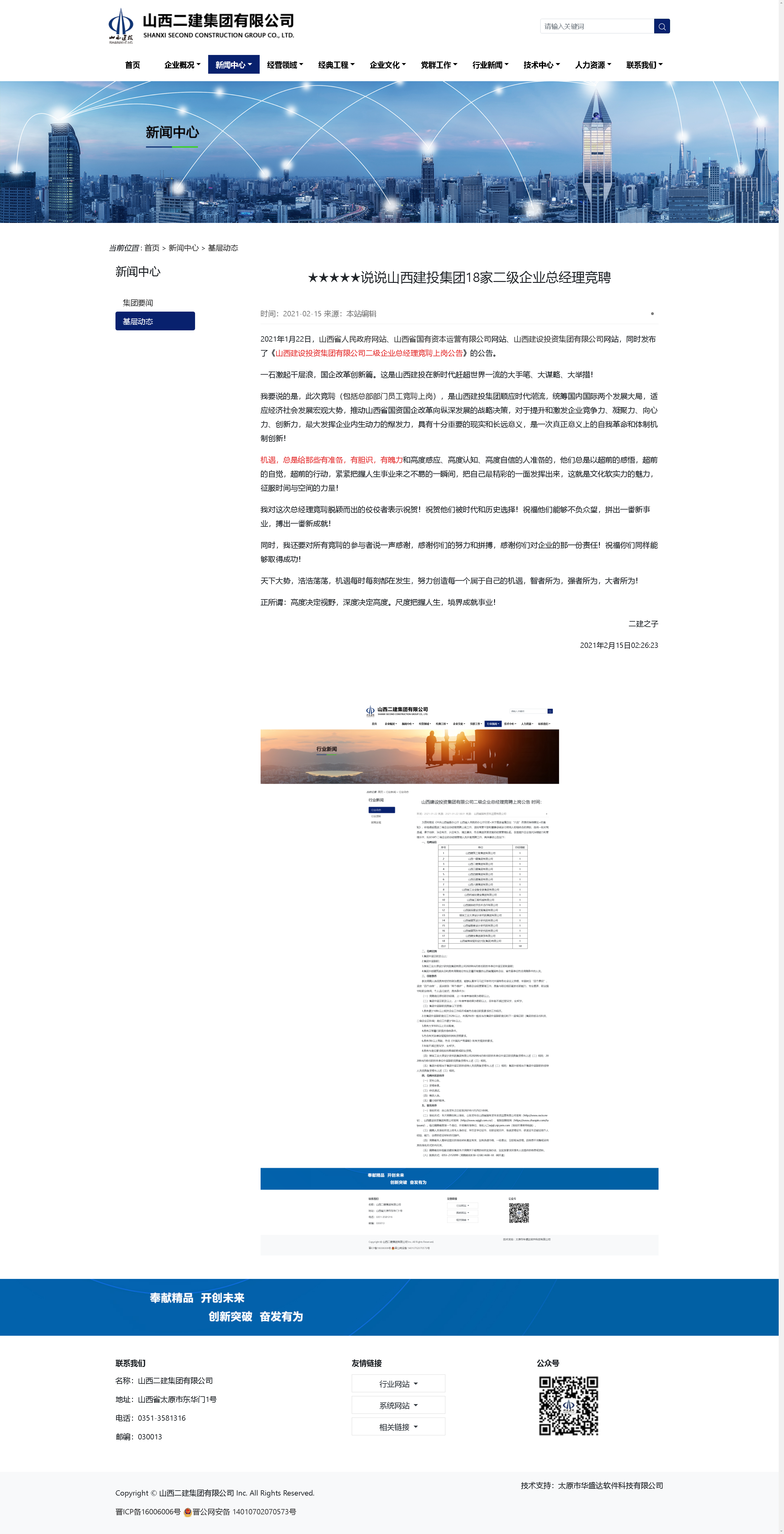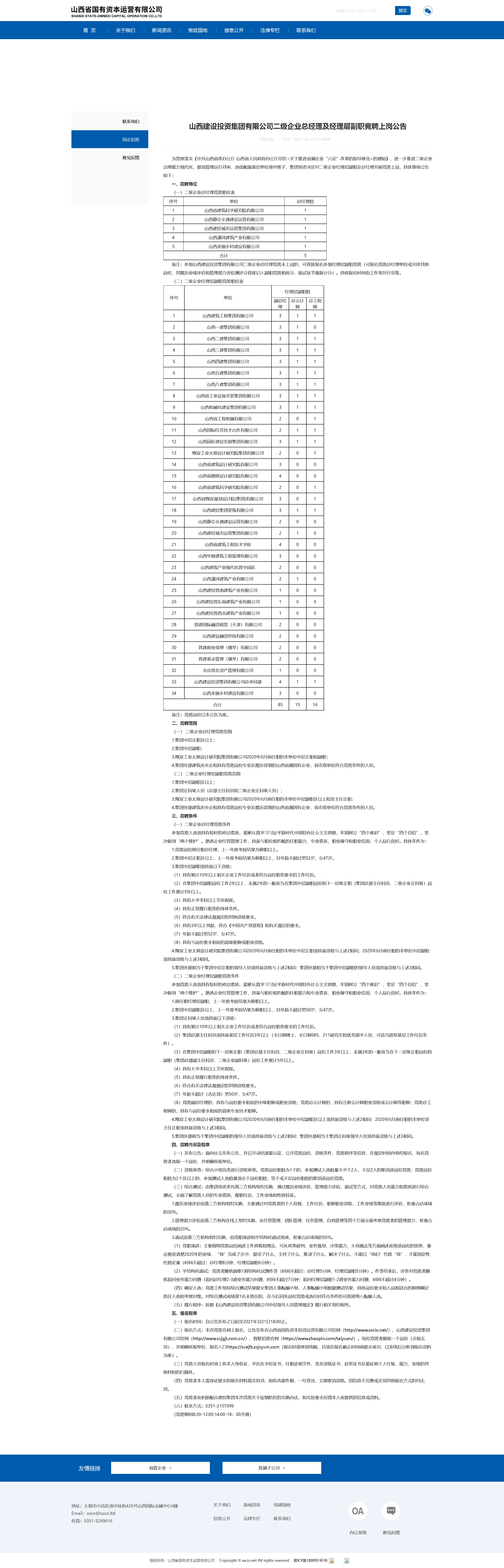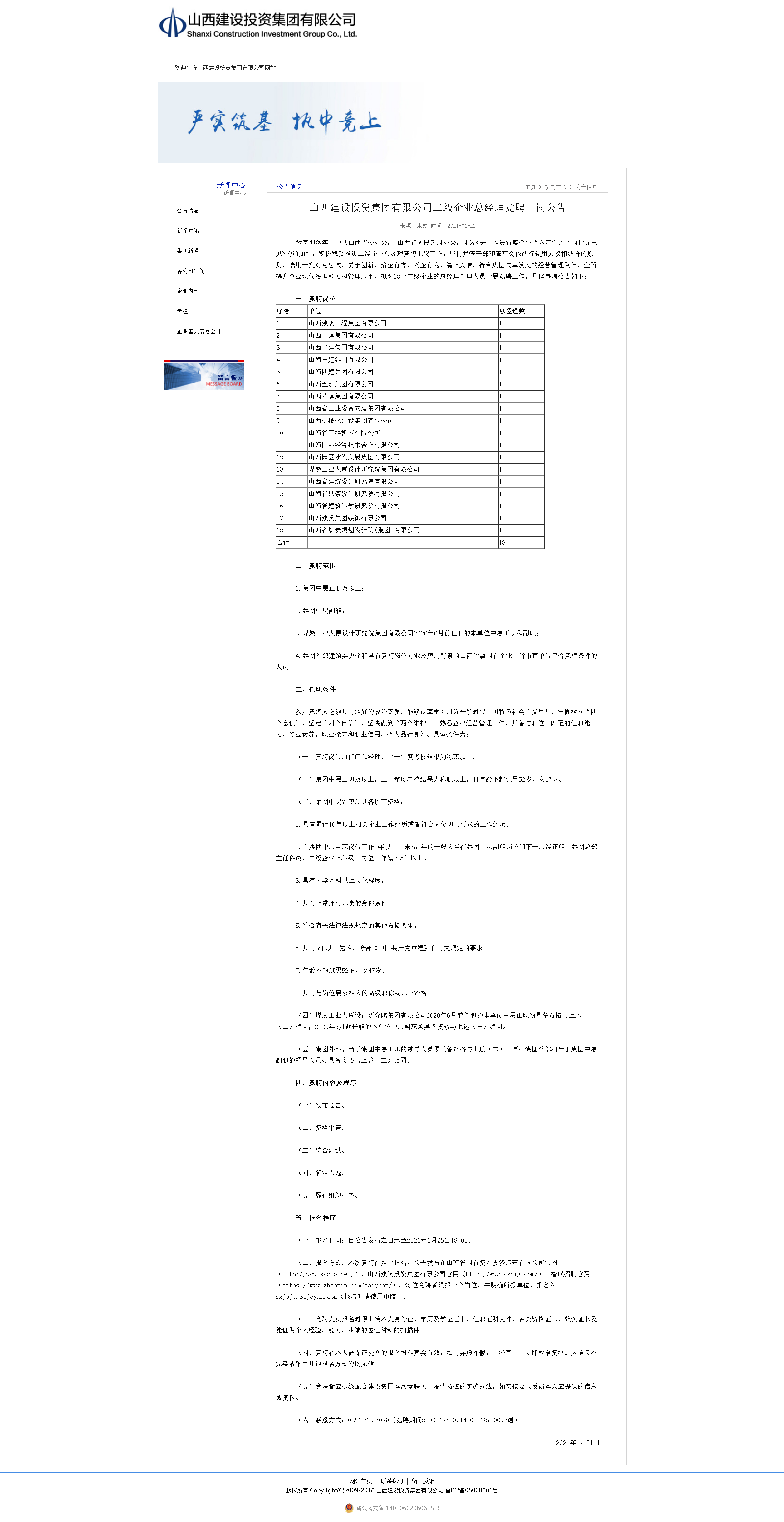 2021年1月22日,山西省人民政府網(wǎng)站、山西省國有資本運營有限公司網(wǎng)站、山西建設(shè)投資集團有限公司網(wǎng)站,同時發(fā)布了《山西建設(shè)投資集團有限公司二級企業(yè)總經(jīng)理競聘上崗公告》的公告。