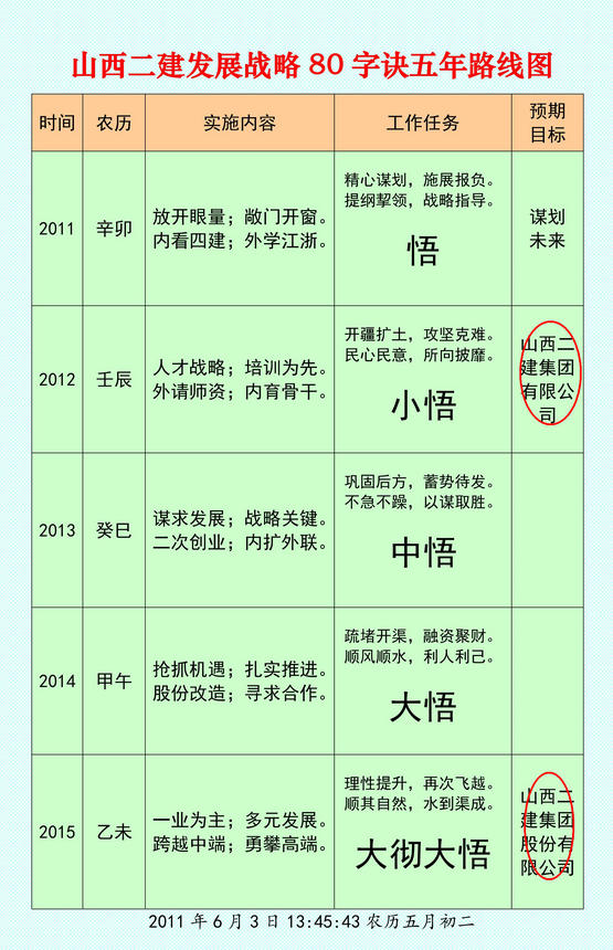 山西二建發展戰略五年路線圖和時間表,從2011年到2020年,分兩個五年兩個階段規劃了十年的成就,是考慮現實和實際的可能性與變化的環境形成的階段性感悟程度。換言之,就看決策者的維度能否自覺接受并且堅定不移去執行!任何事物,懷疑或者遲滯,必將功虧一簣事倍功半!重回大道,二十年以后的事情了!