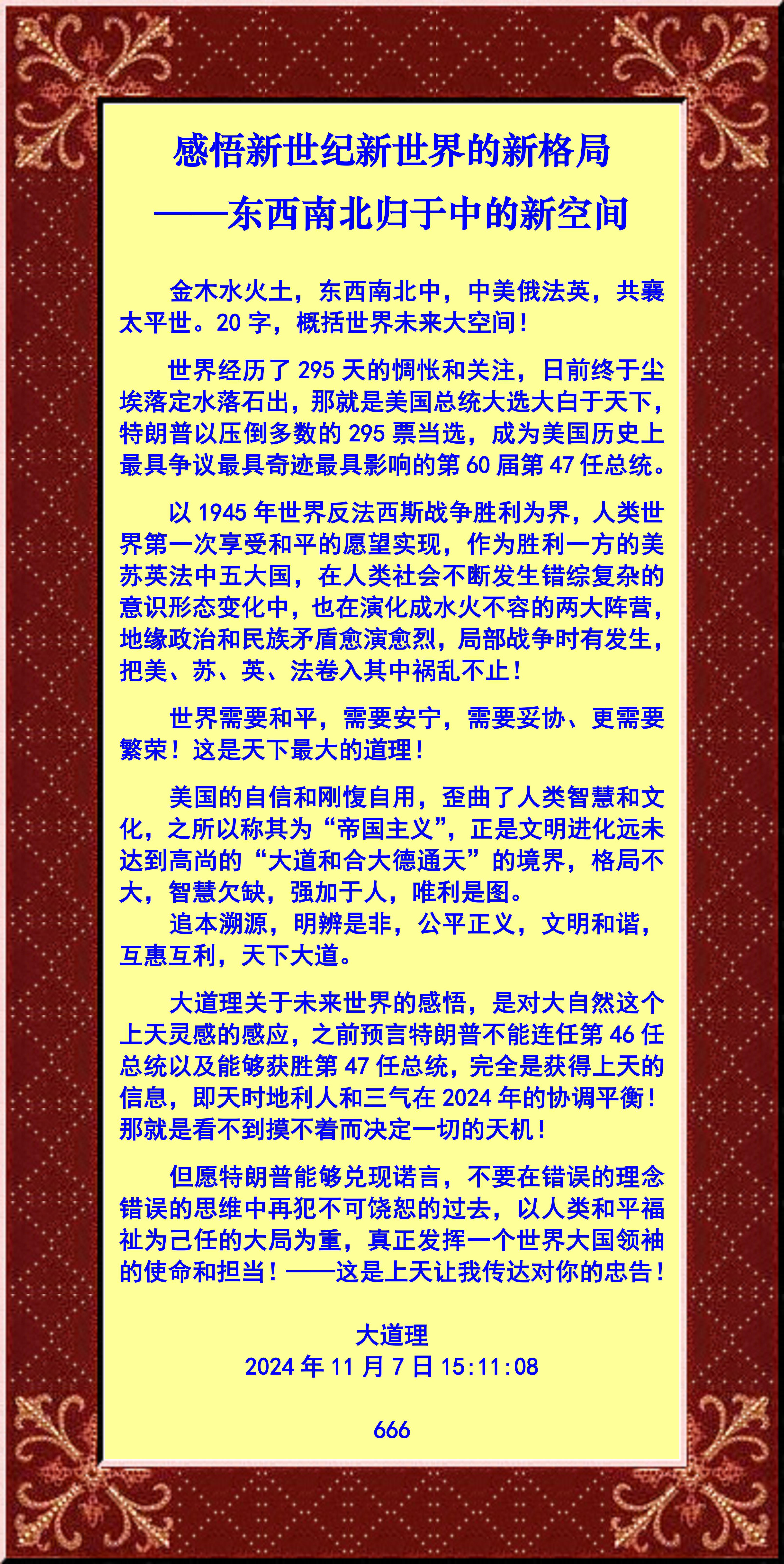大道理關(guān)于未來(lái)世界的感悟,是對(duì)大自然這個(gè)上天靈感的感應(yīng),之前預(yù)言特朗普不能連任第46任總統(tǒng)以及能夠獲勝第47任總統(tǒng),完全是獲得上天的信息,即天時(shí)地利人和三氣在2024年的協(xié)調(diào)平衡!那就是看不到摸不著而決定一切的天機(jī)!