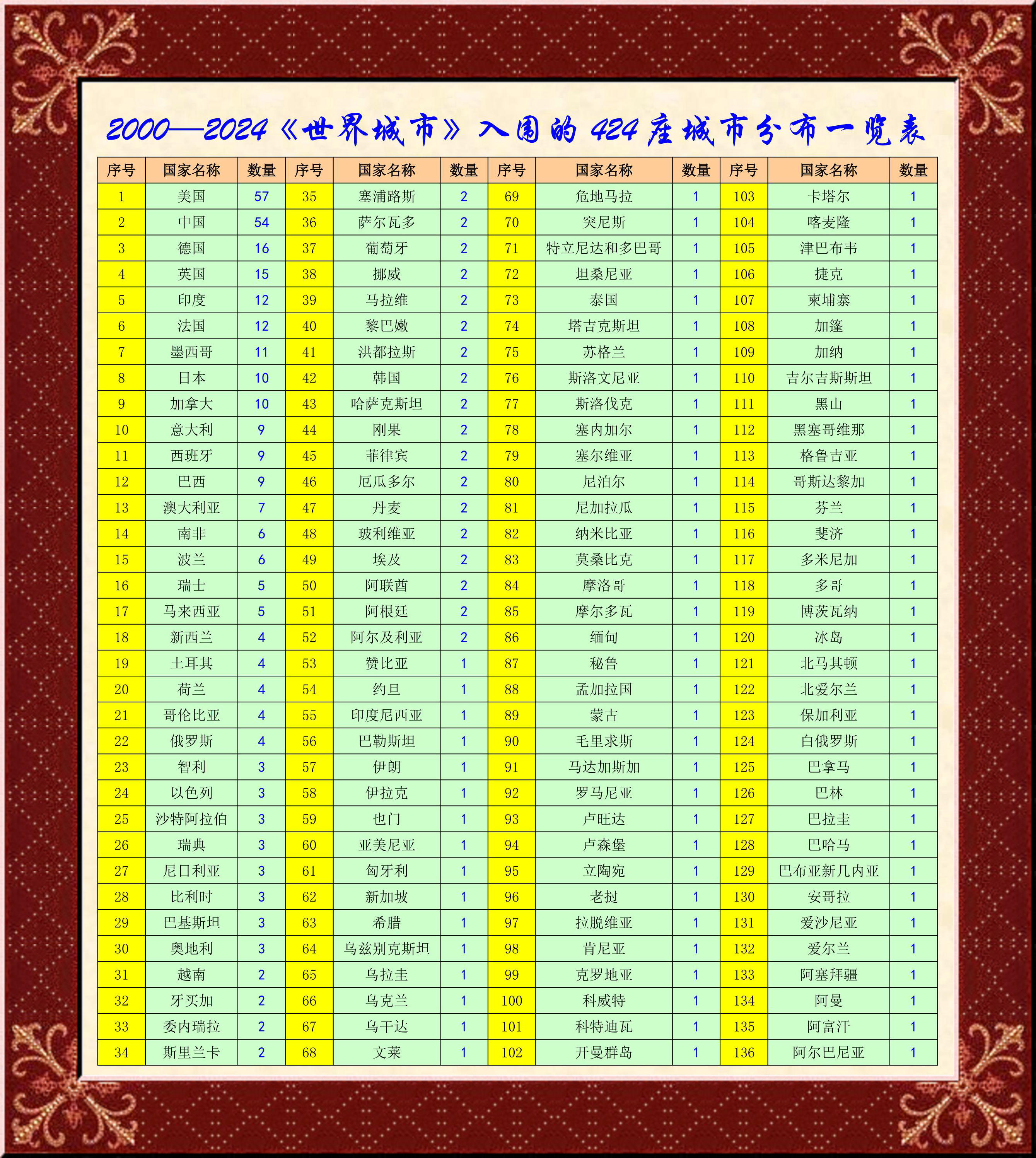 忙了三天的《世界城市名冊全名錄》,總感覺意猶未盡,不能給大家一個一目了然的效果,是什么呢?哦,各國上榜的城市數量呀!