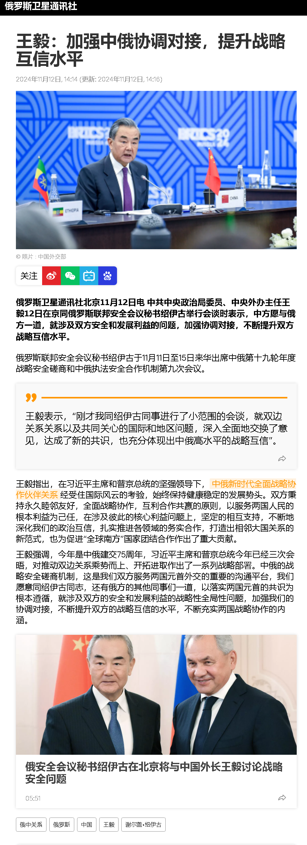 而普京在公開祝賀特朗普當選美國總統時,也曾表示特朗普希望恢復美俄關系,并幫助結束俄烏沖突的表態“是值得關注的”。可見,普京政府還是非常期待特朗普上臺后能夠為解決俄烏沖突注入積極因素,準備認真聽取美方的建議。這自然也將為俄烏局勢帶來新的走向。紹伊古此次來中國,不排除就是想與中國討論一下此事,想聽聽中國的意見。那中方會是什么態度呢?事實上,前幾天中方被問及普京的上述表態時,我外交部發言人毛寧就已經說了,美俄關系如何發展是美國和俄羅斯兩個主權國家的事。至于烏克蘭危機,中方的立場是一貫的,我們支持一切有利于政治解決沖突的努力。