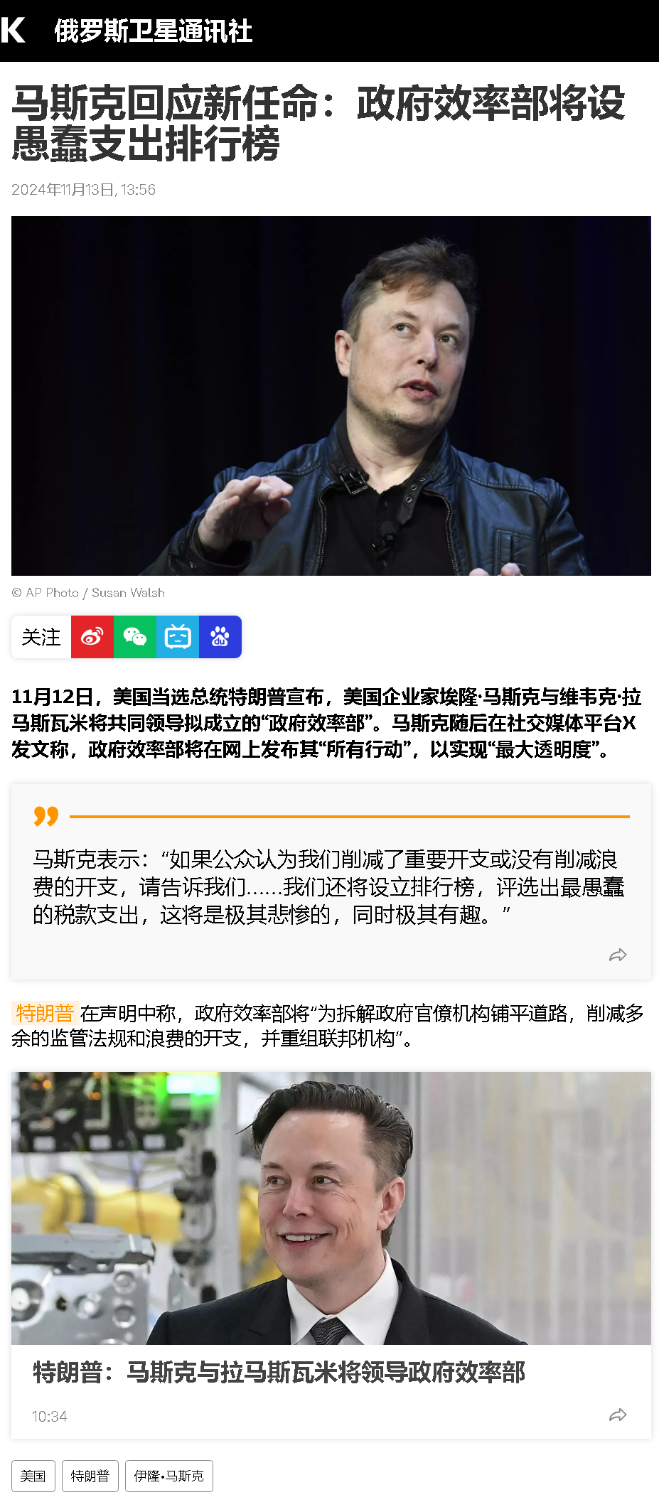 中新網11月13日電 據美國全國廣播公司(NBC)報道,當地時間12日,美國當選總統特朗普宣布,美國企業家埃隆·馬斯克與印度裔美國企業家維韋克·拉馬斯瓦米將在他就任總統后,共同領導擬成立的“政府效率部”,馬斯克將全面監督政府支出。