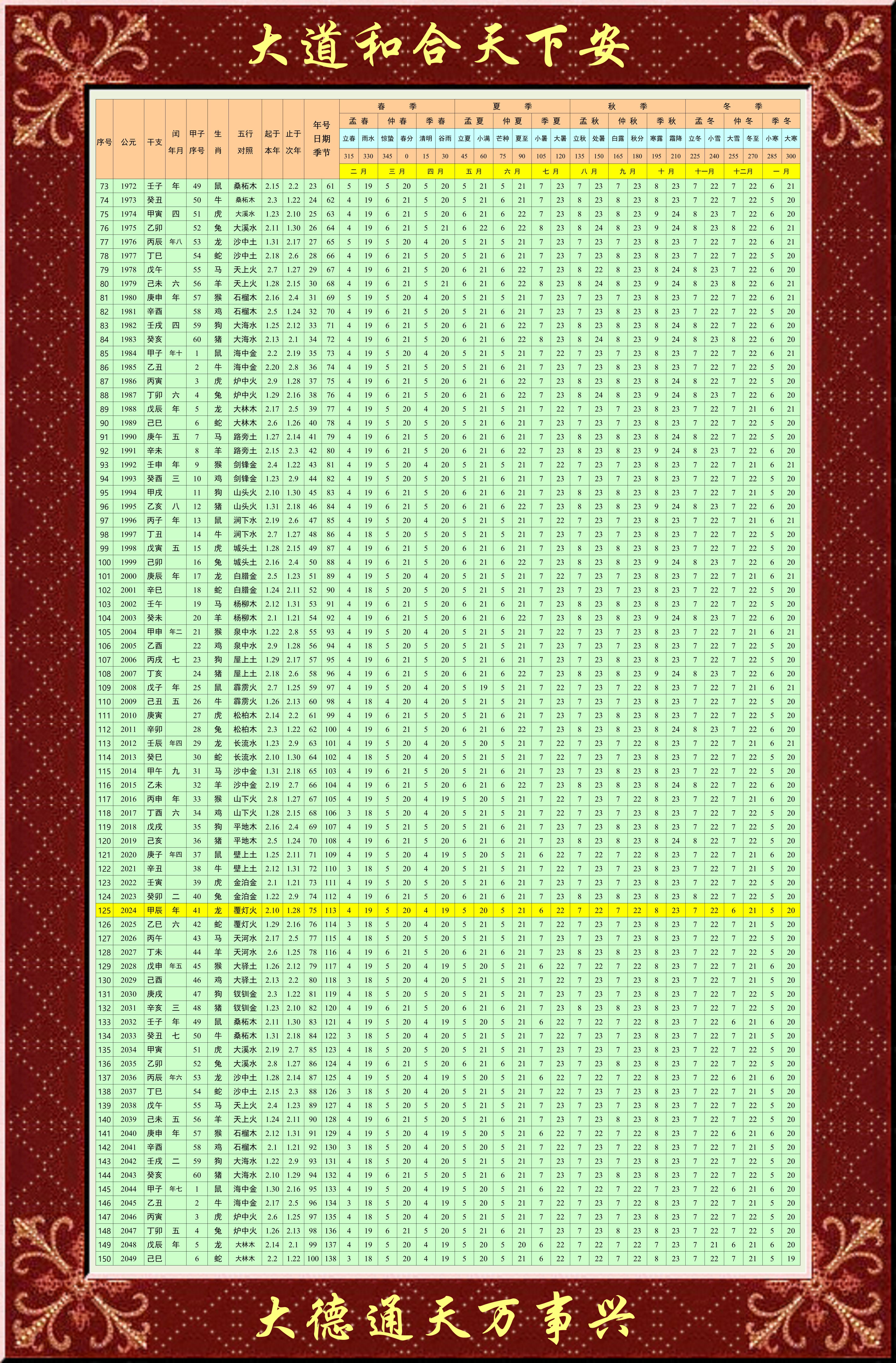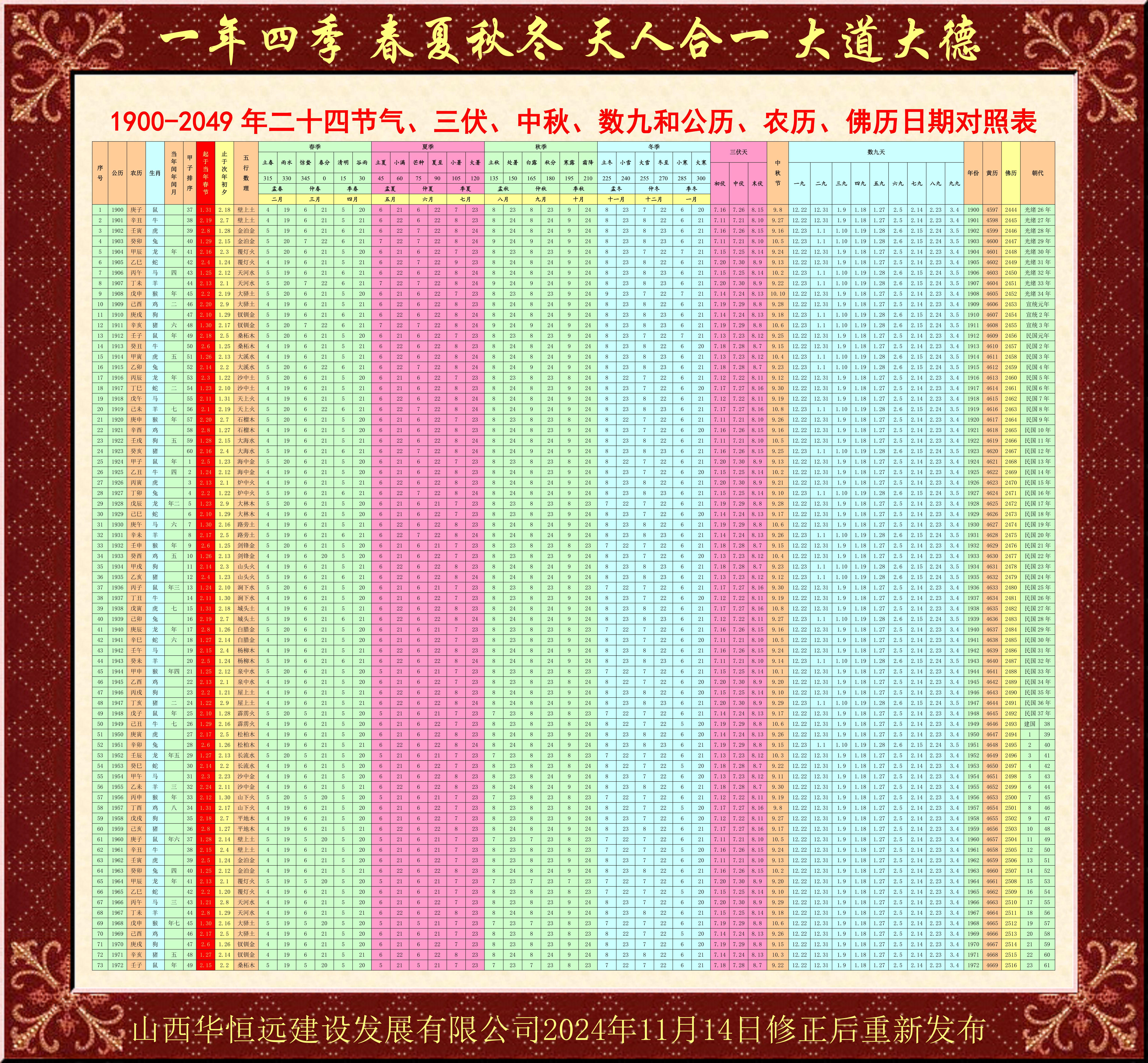 今天重新發(fā)布經(jīng)過修正后的《一百五十年一年四季二十四節(jié)氣》二表,目的是從中感應(yīng)世界和人類社會(huì)在輪回中的變化,哪些年份風(fēng)調(diào)雨順五谷豐登,哪些年份大自然會(huì)發(fā)生災(zāi)難,達(dá)到先知先覺預(yù)見未來,這是一門科學(xué)中的科學(xué),超越時(shí)間空間的大學(xué)問,希望有緣人能夠達(dá)到通靈的高超境界!