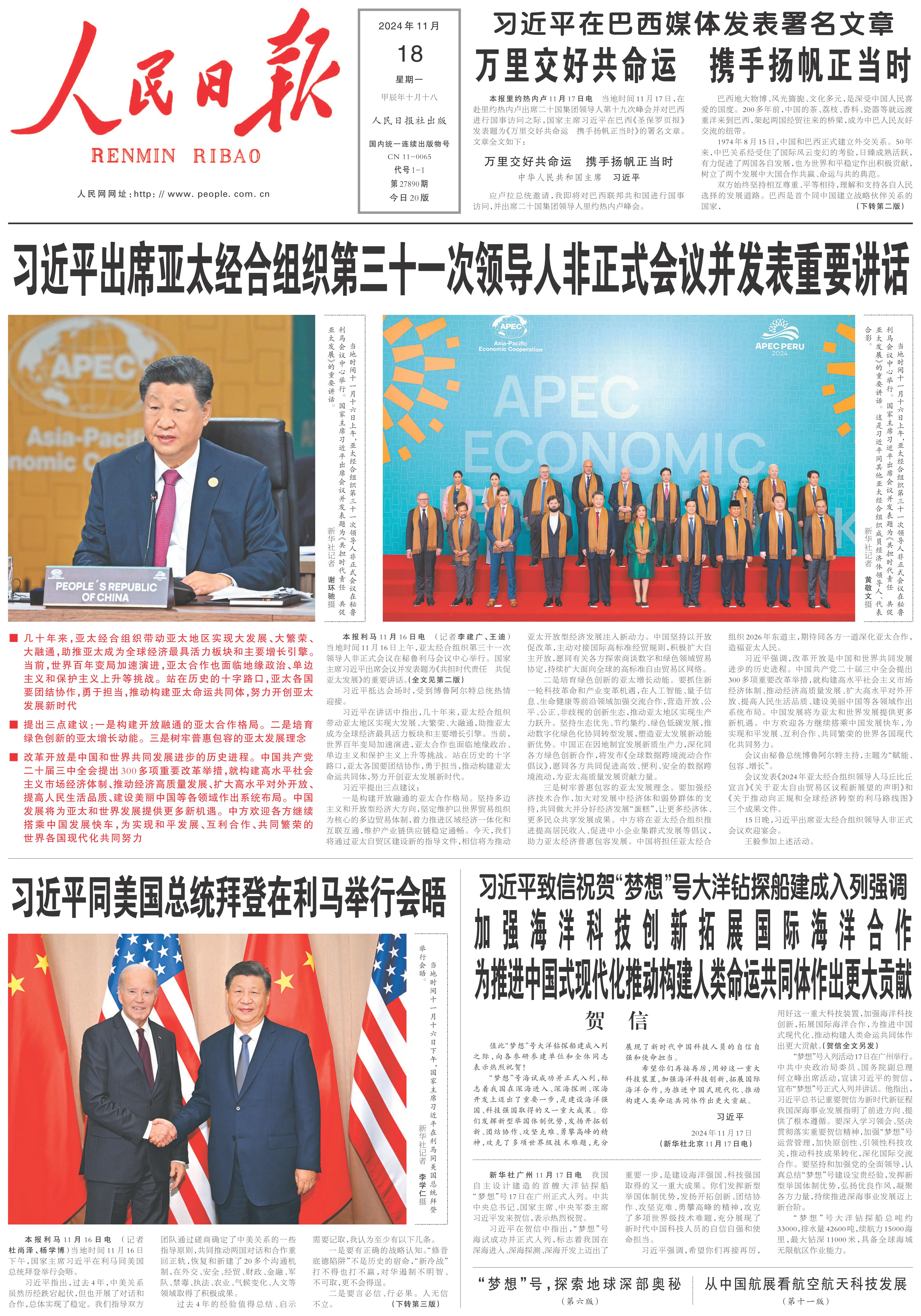16日上午,亞太經合組織第三十一次領導人非正式會議在秘魯利馬會議中心舉行。習近平主席出席會議并發(fā)表題為《共擔時代責任 共促亞太發(fā)展》的重要講話。
