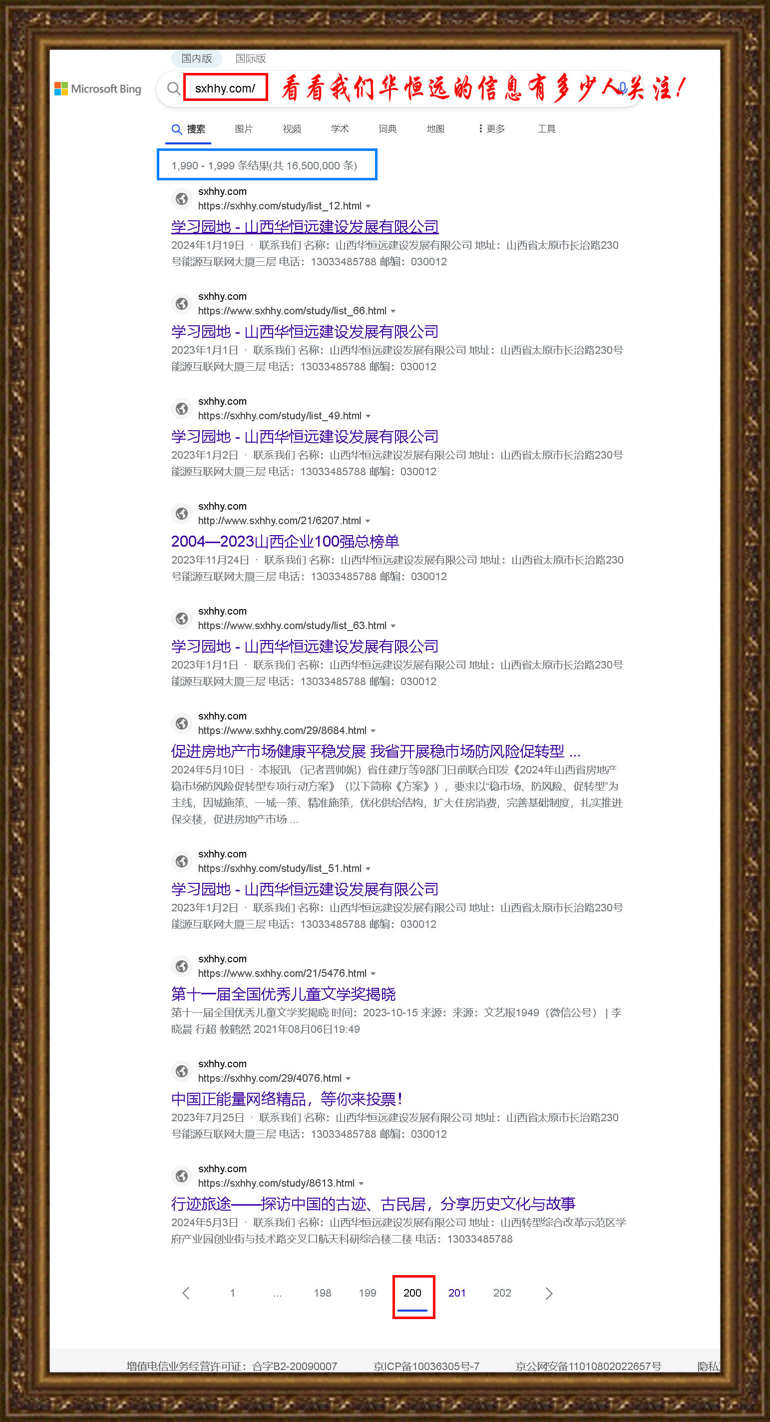 以前,我做山西建協和山西二建的網站空間,最高記錄是69個頁碼,而今天查看華恒遠網站的搜索頁達到了200,讓我感到驚奇!