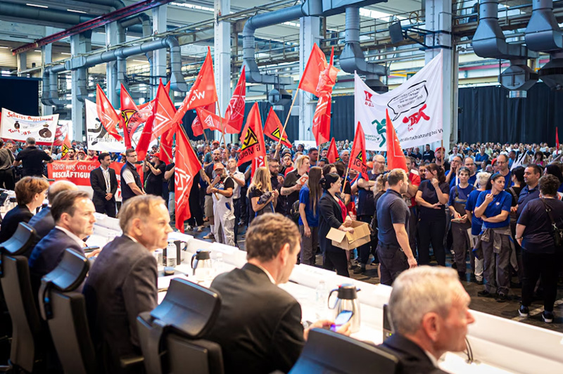 當地時間9月4日,首次傳出將關閉本土工廠消息后,大眾汽車在總部舉行員工大會,工人們手舉標語抗議。 路透社