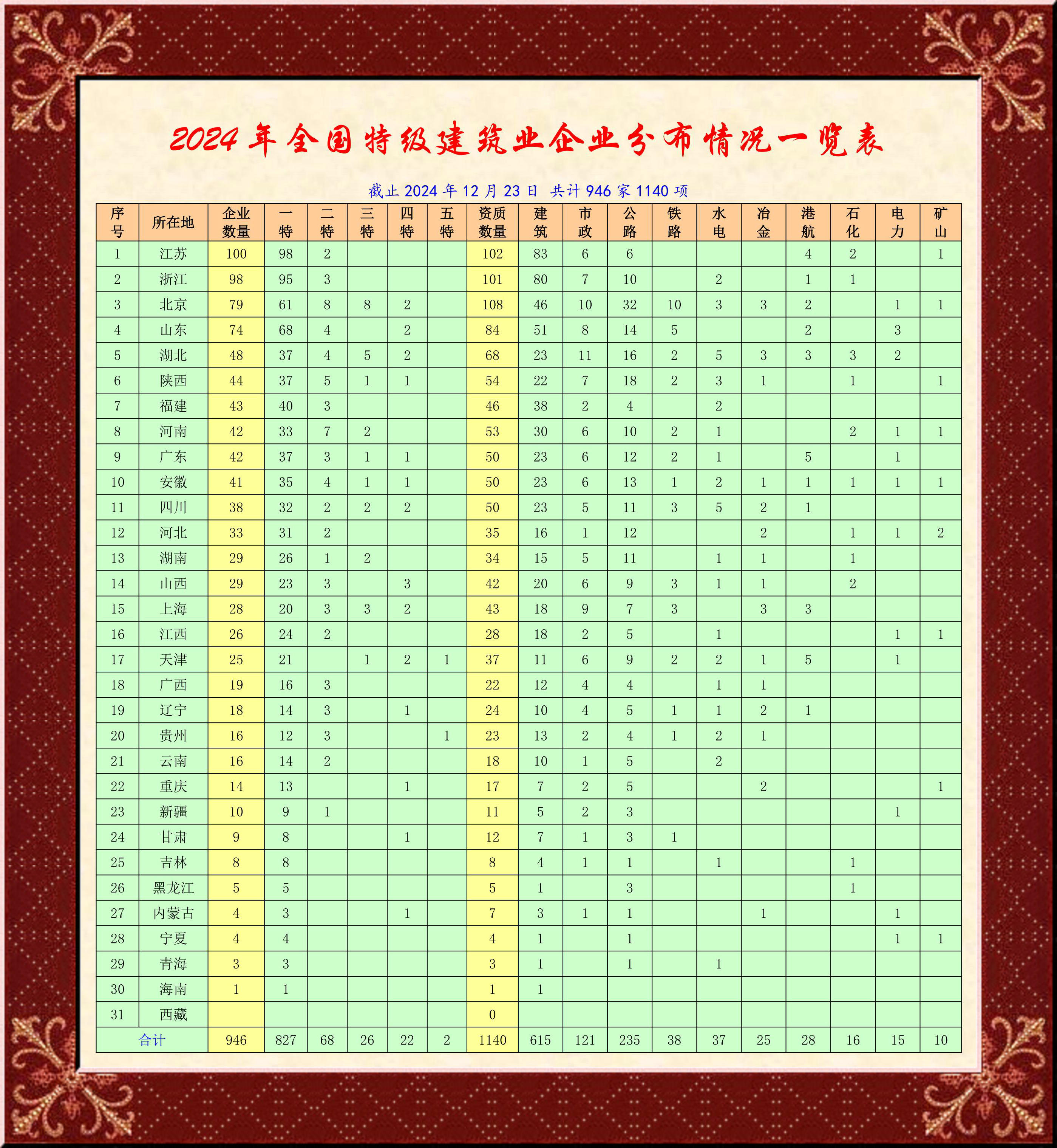 2024年核準(zhǔn)建筑業(yè)企業(yè)特級資質(zhì)名單