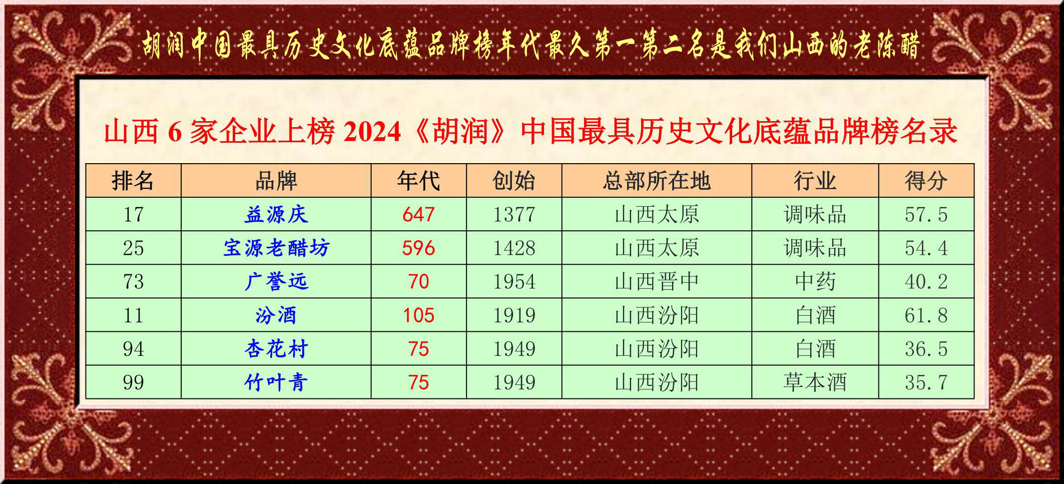 1 益源慶 1377 647 山西太原 調味品 17 57.5