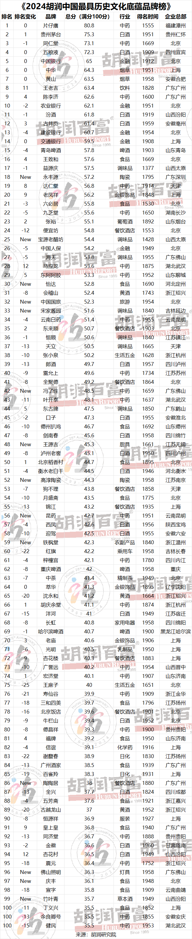 排名 品牌 創始年代 品牌年代 總部所在地 行業 2024排名 得分