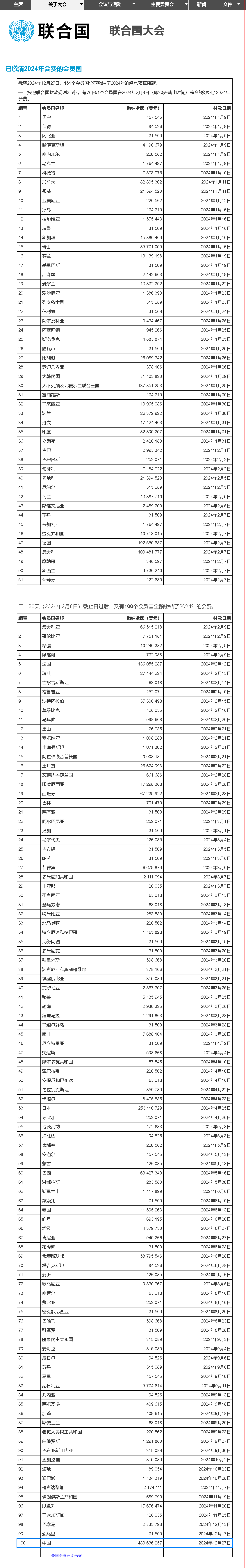 一、按照聯(lián)合國財政規(guī)則3.5條,有以下51個會員國在2024年2月8日(即30天截止時間)前全額繳納了2024年會費。