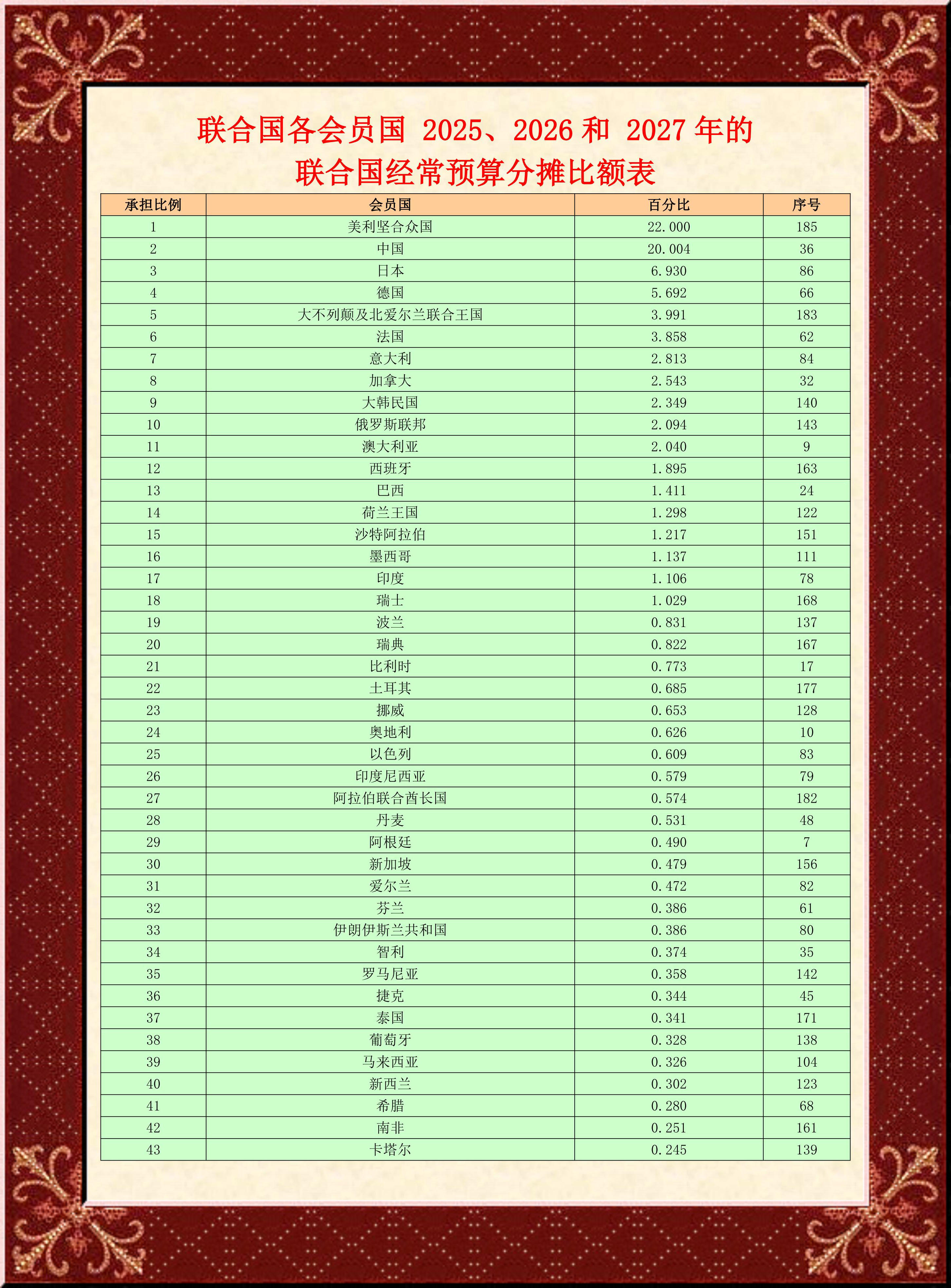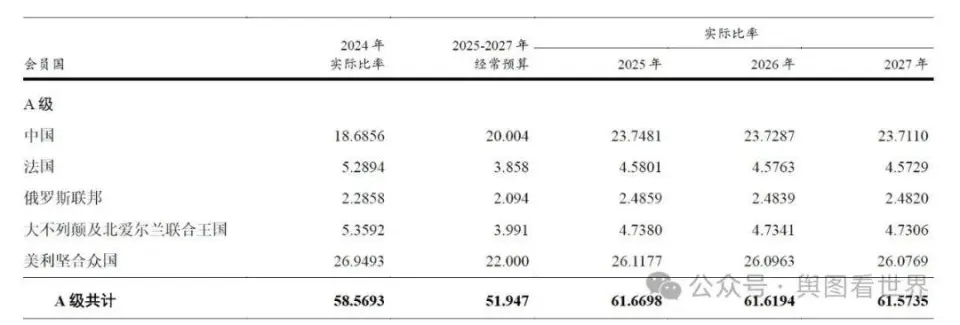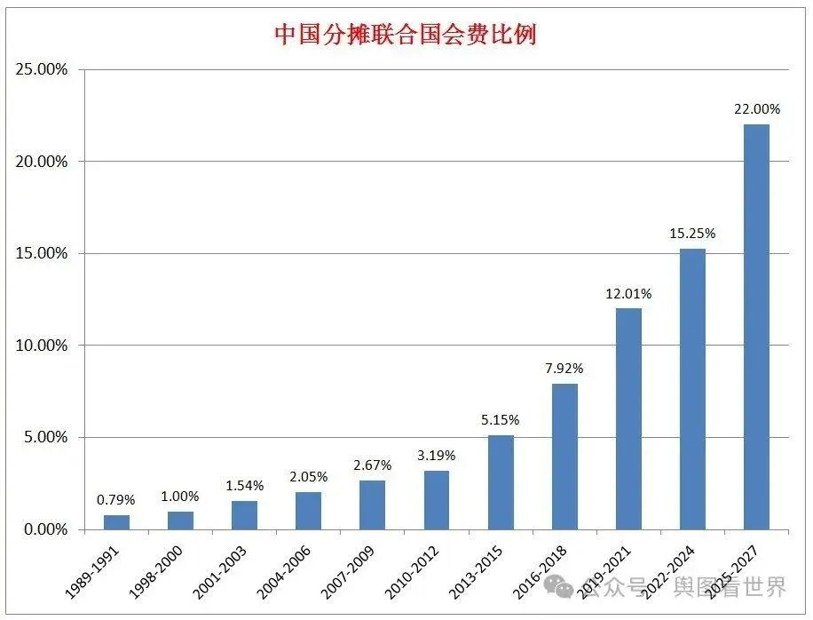 2022-2024年,中國的分?jǐn)偙葹?5.254%,每年依次繳納4.76億美元、5.18億美元、5.48億美元,合計繳納15.42億美元。中國因為強勁的經(jīng)濟表現(xiàn)與影響力,占比由目前的15.254%增加4.75%,達到20.004%。這也是中國占比首超20%,直逼美國的22%。未來三年,即使每年的會費均為37.17億美元,那么中國合計需繳納22.30億美元。換言之,2025-2027年中國至少要多繳納6.88億美元,折合人民幣約50.21億。需要注意的是,聯(lián)合國的常規(guī)預(yù)算每年都有小幅增長,因此中國的實際繳納金額可能會更高。