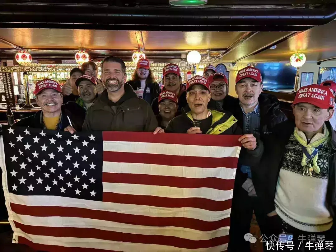 特朗普在發圖的時候,他的兒子小特朗普正在格陵蘭島旅行,積極宣傳特朗普的主張,還和當地人共同拿著美國國旗合影。