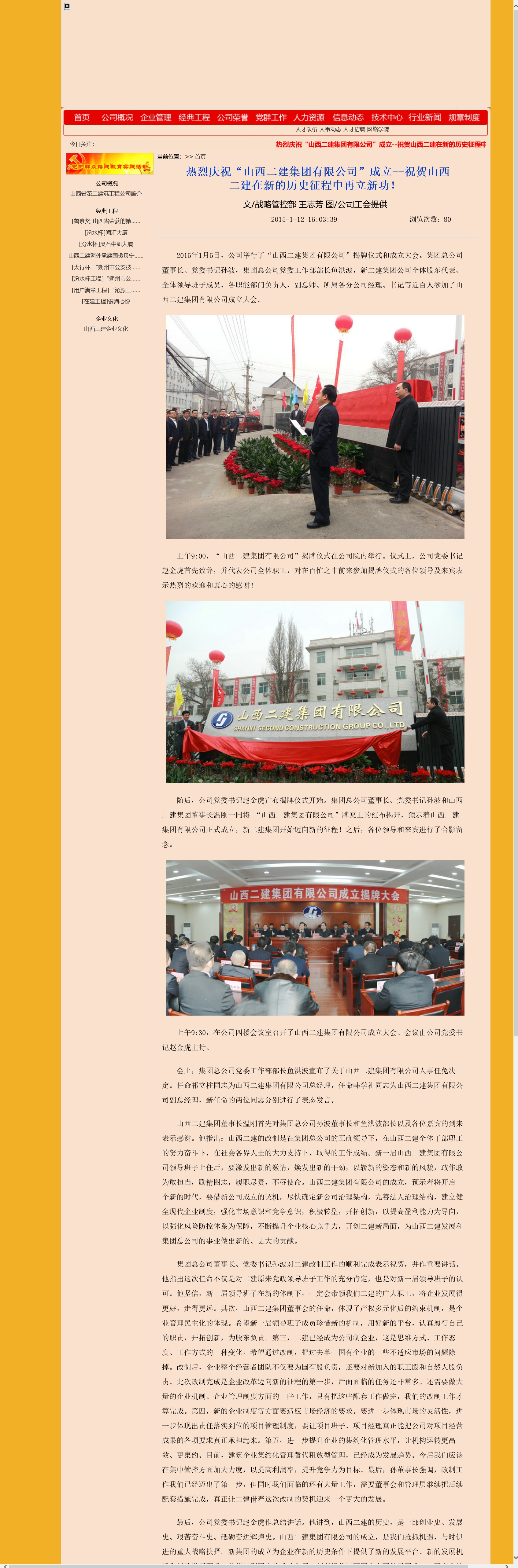 當時,他立刻打電話通知對方原路返回,表示承擔一切損失。隨后完全按照我的意見實施,就連字體都是征求我的意見制作的。2015年1月5日,山西二建集團有限公司揭牌儀式順利進行,使用近三十五年的山西省第二建筑工程公司名稱正式退出歷史舞臺,宣告改制后的山西二建正式成立!