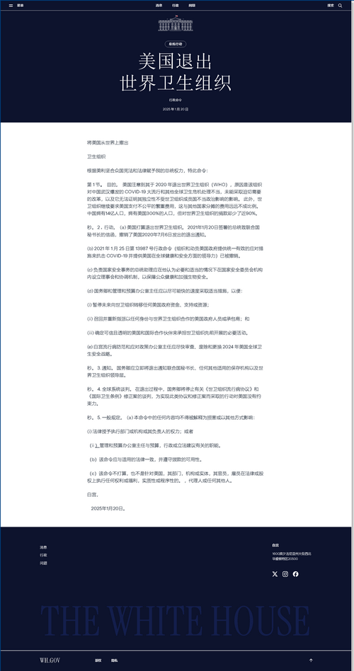白宮發(fā)布的行政令稱,美國國務(wù)卿應(yīng)將美國這一決定立即通知聯(lián)合國秘書長和世衛(wèi)組織領(lǐng)導(dǎo)層。行政令還要求盡快采取適當措施,暫停向世衛(wèi)組織提供任何來自美國政府的資金、支持和資源。