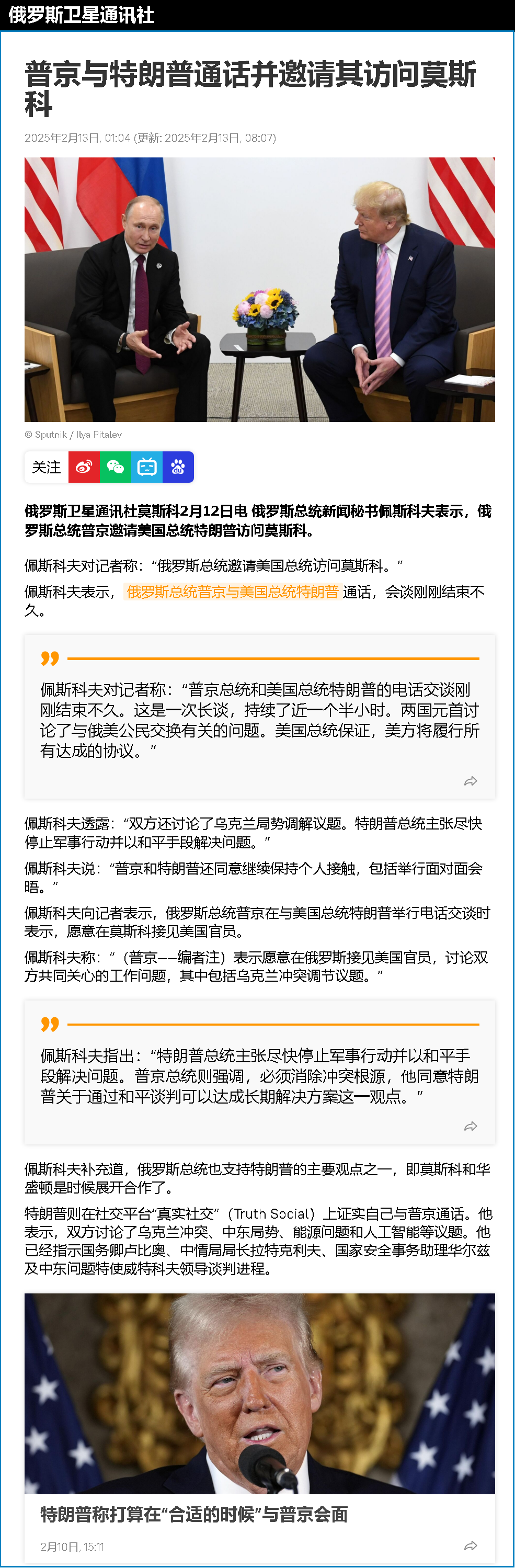 當天早些時候,特朗普先后與普京和烏克蘭總統澤連斯基通電話,討論烏克蘭局勢等問題。特朗普表示,上述兩個通話成果都“非常好”,普京和澤連斯基均希望俄烏實現和平。