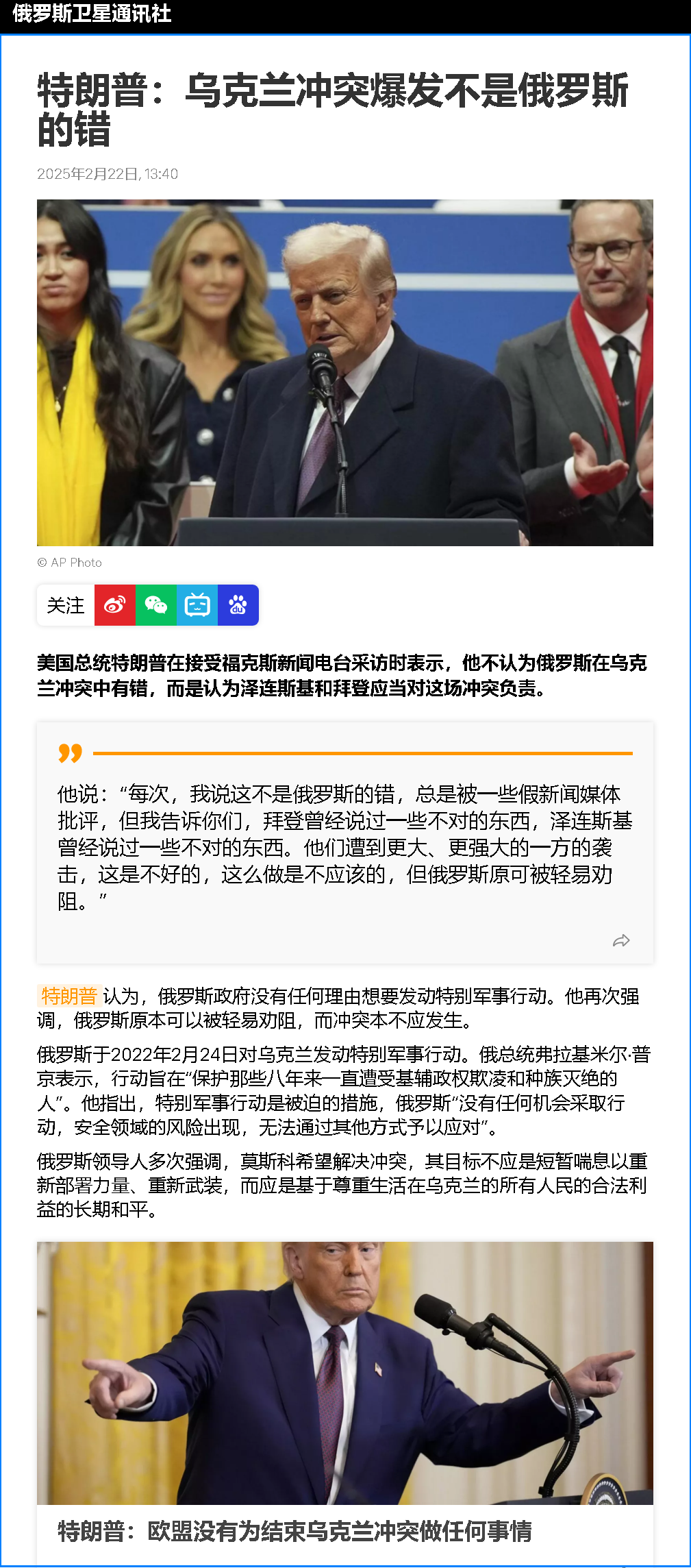 特朗普稱,澤連斯基在俄烏沖突的三年中“一直在談判,卻什么都沒達成”,所以“我不認為他參加會談有那么重要……他讓達成協(xié)議變得非常困難。”很多媒體在報道中強調(diào),特朗普此番言論與事實不符。