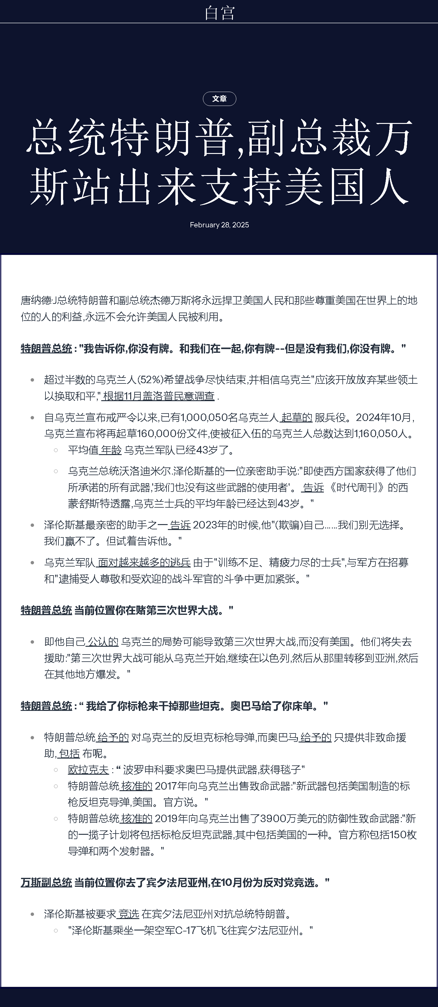 澤連斯基在離開白宮后在社交媒體上發文,對美國給予烏克蘭的支持向特朗普和美國人民表達感謝,但他同時強調:“烏克蘭需要正義和持久的和平,我們正為此努力?!?