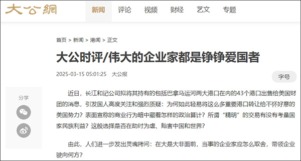 3月15日,香港《大公報》發布題為“偉大的企業家都是錚錚愛國者”的時評,就李嘉誠旗下香港長江和記實業有限公司擬將包括巴拿馬運河兩大港口在內的43個港口出售給美國財團的消息提出5個問題。