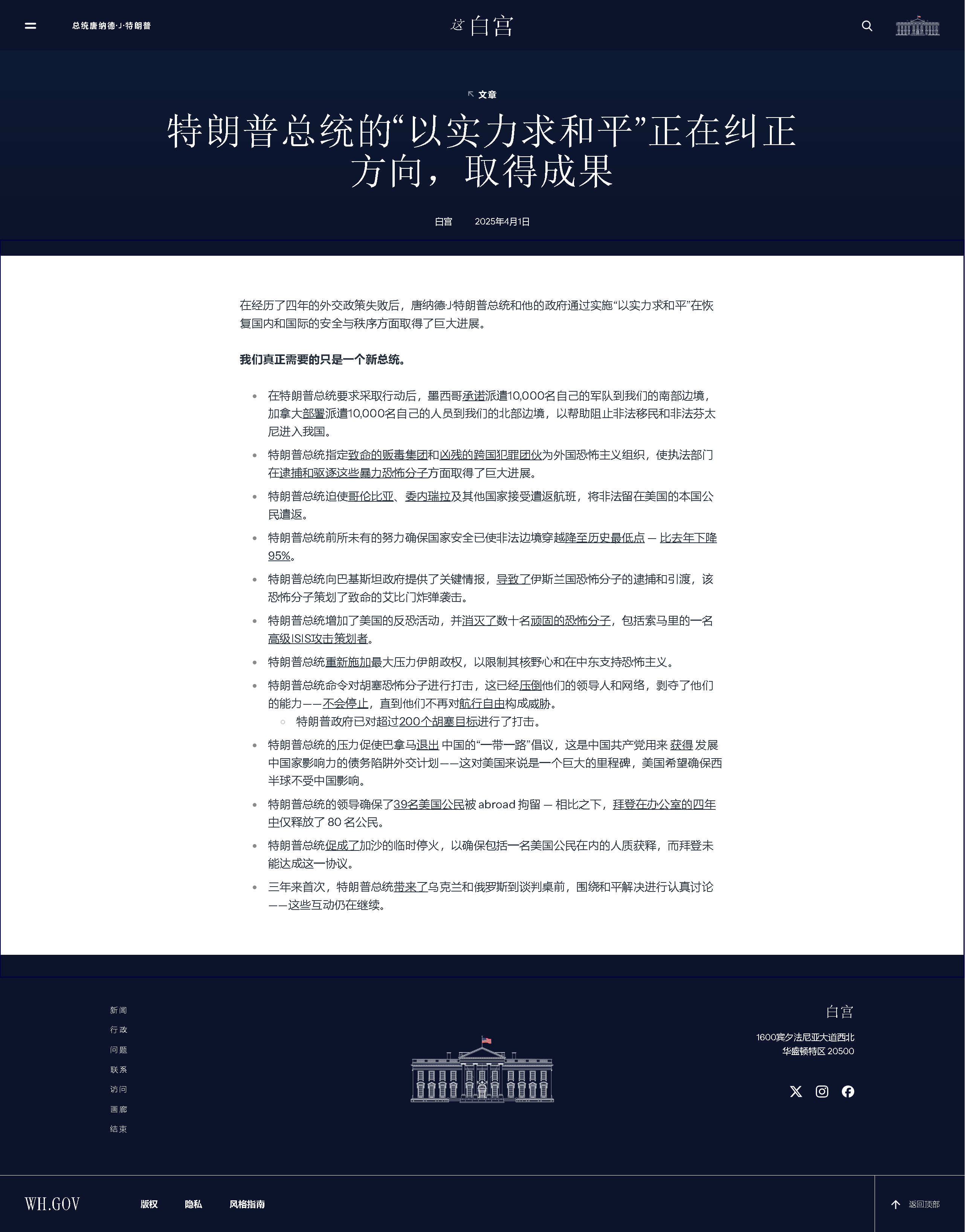 在經歷了四年的外交政策失敗后,唐納德·J·特朗普總統和他的政府通過實施“以實力求和平”在恢復國內和國際的安全與秩序方面取得了巨大進展。