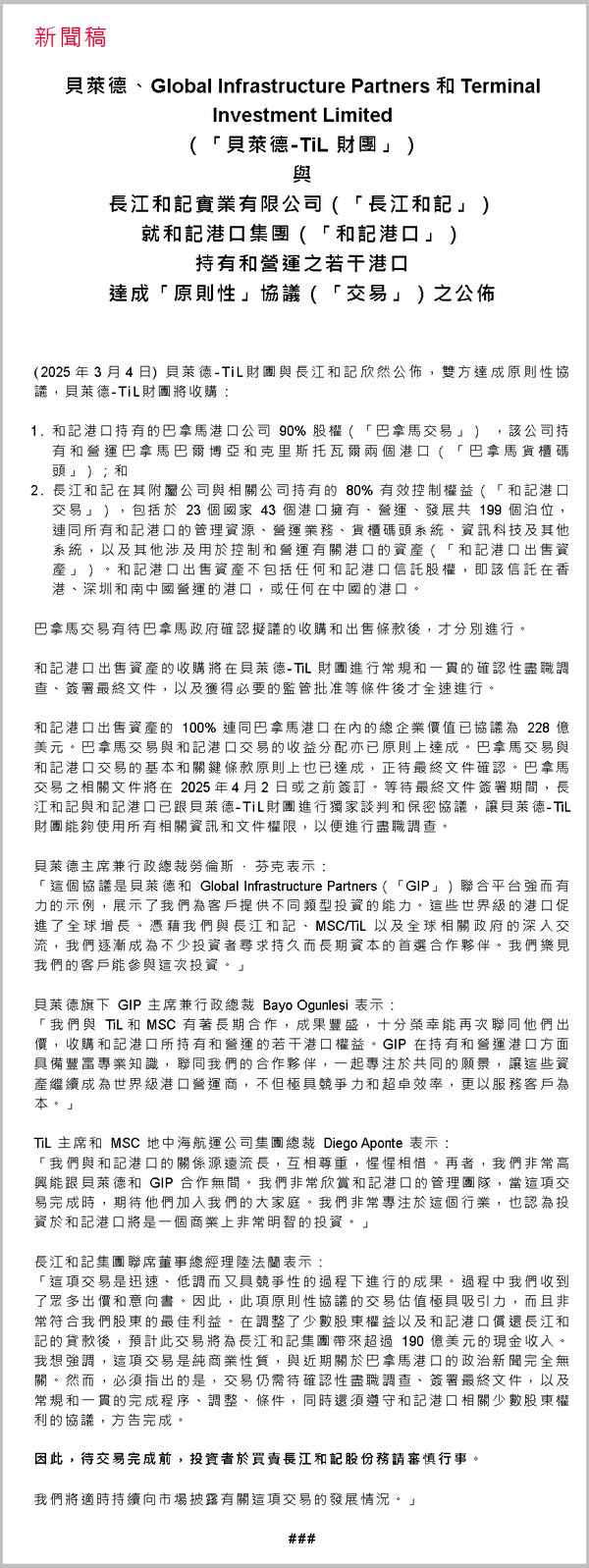 對(duì)此,李嘉誠(chéng)始終保持沉默,長(zhǎng)和更是以“在商言商”進(jìn)行搪塞。但戲劇性轉(zhuǎn)折來(lái)得猝不及防。就在輿論壓力攀至頂點(diǎn)時(shí),市場(chǎng)傳出大陸國(guó)有航運(yùn)企業(yè)擬接手部分港口的消息。長(zhǎng)和雖未官宣,卻已悄然撤回向貝萊德轉(zhuǎn)讓葵青碼頭股權(quán)的計(jì)劃。