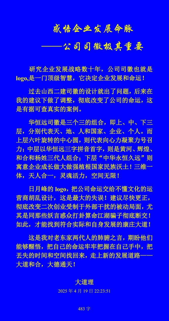 日月峰的logo,把公司命運交給不懂文化的運營商胡亂設計,這是最大的失誤!建議盡快更正,徹底改變二次創(chuàng)業(yè)受制于外部干擾的被動局面,尤其是同那些妖言惑眾打卦算命江湖騙子徹底斷交!如此,才能找到符合實際和自身發(fā)展的康莊大道!