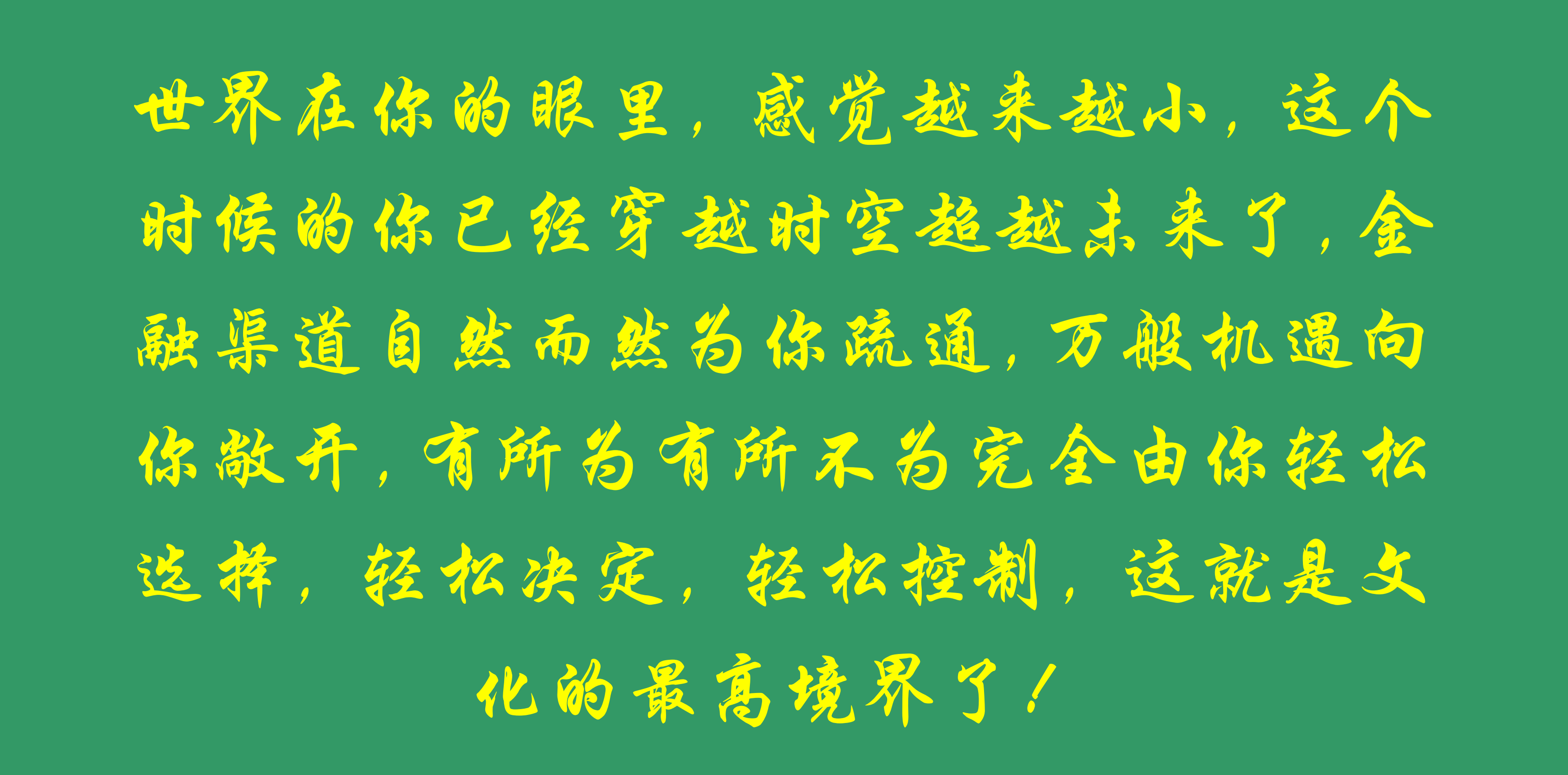 做一個企業家,一個世界級的大企業家,必須有高度的覺悟,高度的責任,高度的主動,這就是使命感和事業心的高度統一,高度融合,高度完善。上升到這個高度,你的公司才能越做越大,越做越強,越做越優。世界在你的眼里,感覺越來越小,這個時候的你已經穿越時空超越未來了,金融渠道自然而然為你疏通,萬般機遇向你敞開,有所為有所不為完全由你輕松選擇,輕松決定,輕松控制,這就是文化的最高境界了!