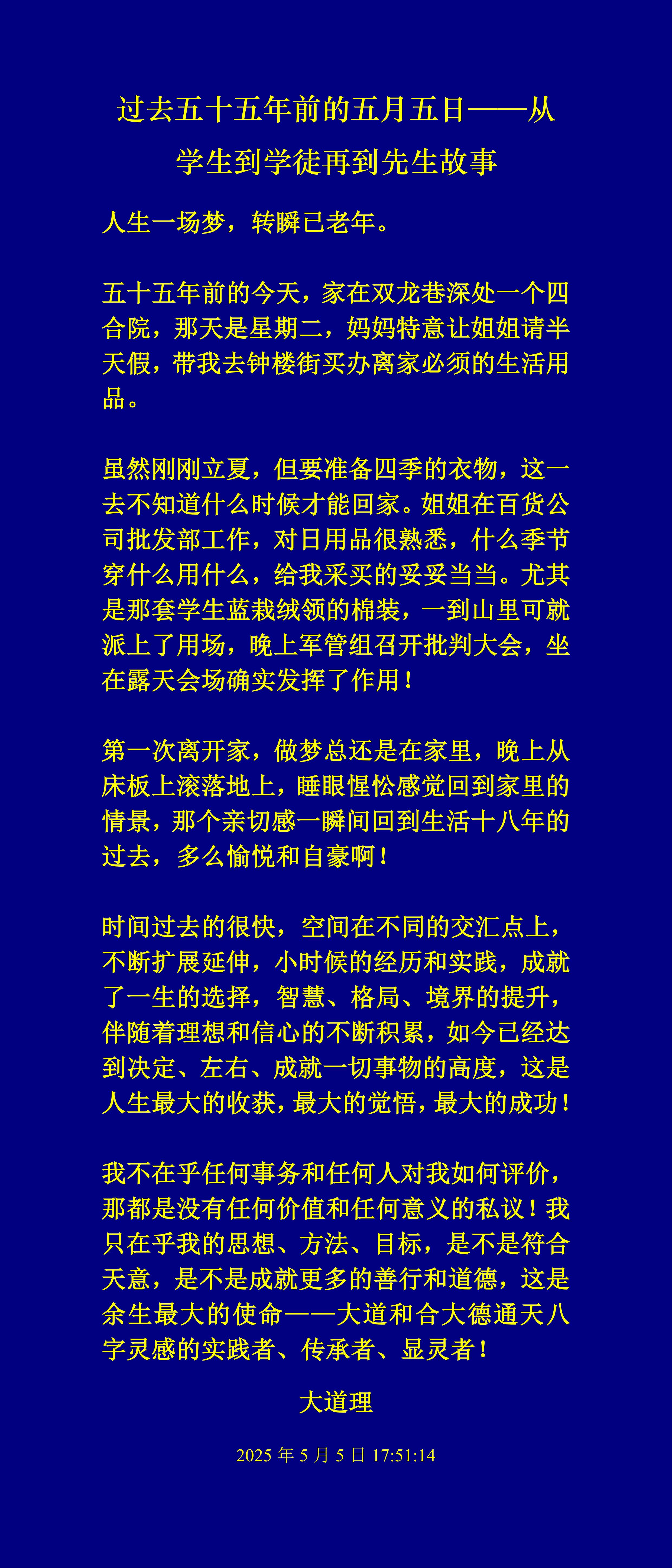 我不在乎任何事務和任何人對我如何評價,那都是沒有任何價值和意義的私議!我只在乎我的思想、方法、目標,是不是符合天意,是不是成就更多的善行和道德,這是余生最大的使命——大道和合大德通天八字靈感的實踐者、傳承者、顯靈者!