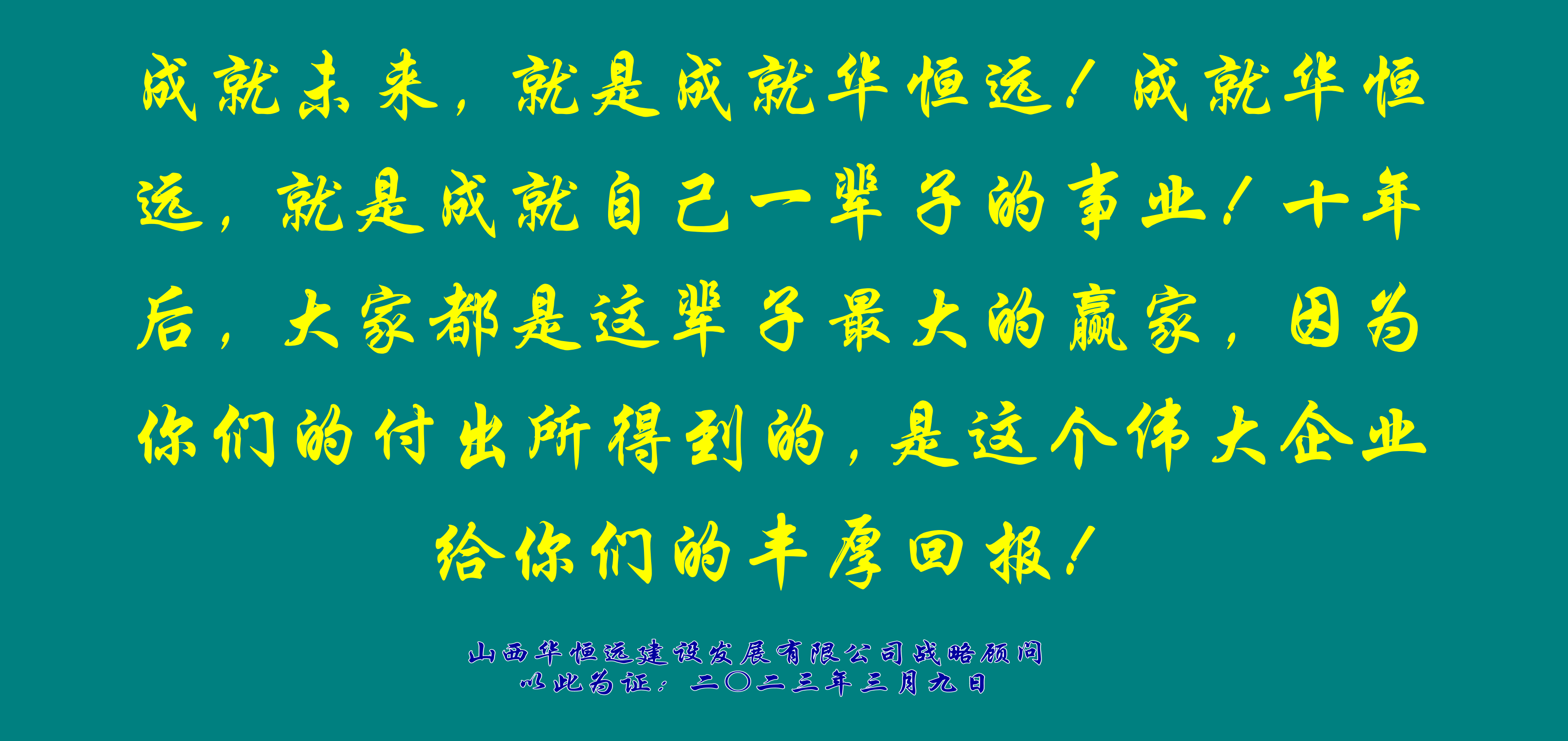 成就未來(lái),就是成就華恒遠(yuǎn)!成就華恒遠(yuǎn),就是成就自己一輩子的事業(yè)!十年后,大家都是這輩子最大的贏家,因?yàn)槟銈兊母冻鏊玫降模沁@個(gè)偉大企業(yè)給你們的豐厚回報(bào)!
