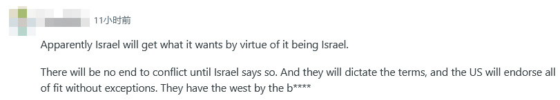 還有人指出,美國在中東地區(qū)的沖突中過于偏袒以色列,“顯然,以色列能得到它想要的,因?yàn)樗且陨?。在以色列說出來之前,沖突不會(huì)結(jié)束,他們將決定條款,而美國將毫無例外地支持所有條件?!?
