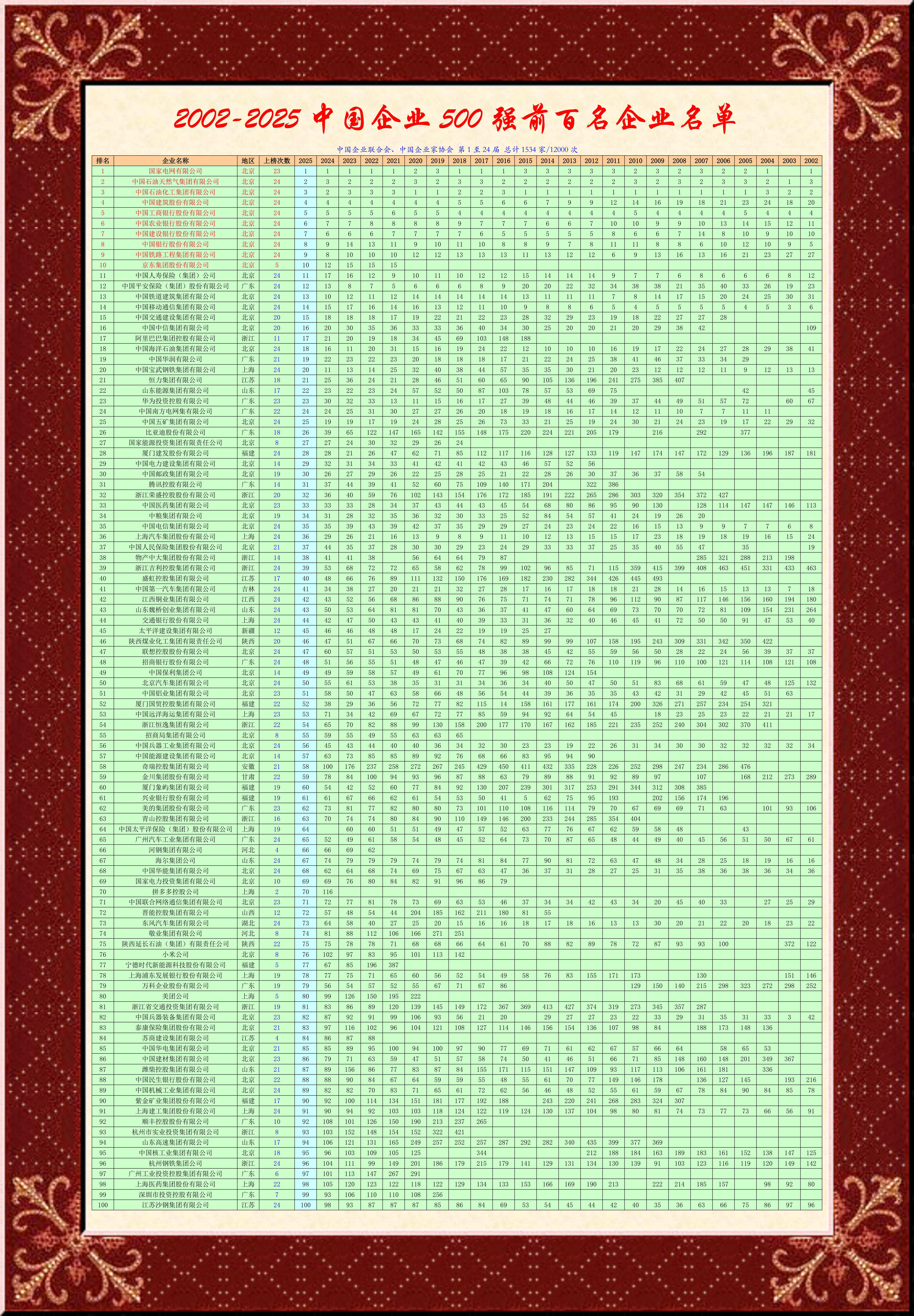 【學(xué)習(xí)園地】2025中國企業(yè)500強(qiáng)前百名上榜次數(shù)明細(xì)表