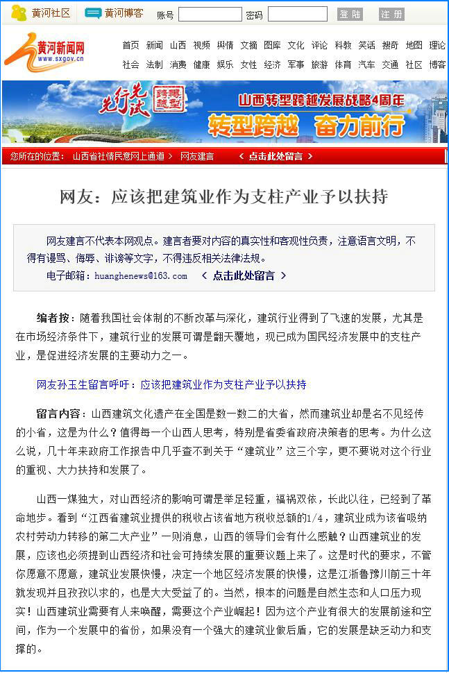 留言內容:山西建筑文化遺產在全國是數一數二的大省,然而建筑業卻是名不見經傳的小省,這是為什么?值得每一個山西人思考,特別是省委省政府決策者的思考。為什么這么說,幾十年來政府工作報告中幾乎查不到關于“建筑業”這三個字,更不要說對這個行業的重視、支持、大力扶持和發展了。山西一煤獨大,對山西經濟的影響可謂是舉足輕重,福禍雙依,長此以往,已經到了革命地步。看到“江西省建筑業提供的稅收占該省地方稅收總額的1/4,建筑業成為該省吸納農村勞動力轉移的第二大產業”一則消息,山西的領導們會有什么感觸?山西建筑業的發展,應該也必須提到山西經濟和社會可持續發展的重要議題上來了,這是時代的要求,不管你愿意不愿意,建筑業發展快慢,決定一個地區經濟發展的快慢,這是江浙魯豫川前三十年就發現并且孜孜以求的,也是大大受益了的。當然,根本的問題是自然生態和人口壓力逼迫的!山西建筑業需要有人來喚醒,需要這個產業崛起!因為這個產業有很大的發展前途和空間,作為一個發展中的省份,如果沒有一個強大的建筑業做后盾,她的發展是缺乏動力和支撐的。