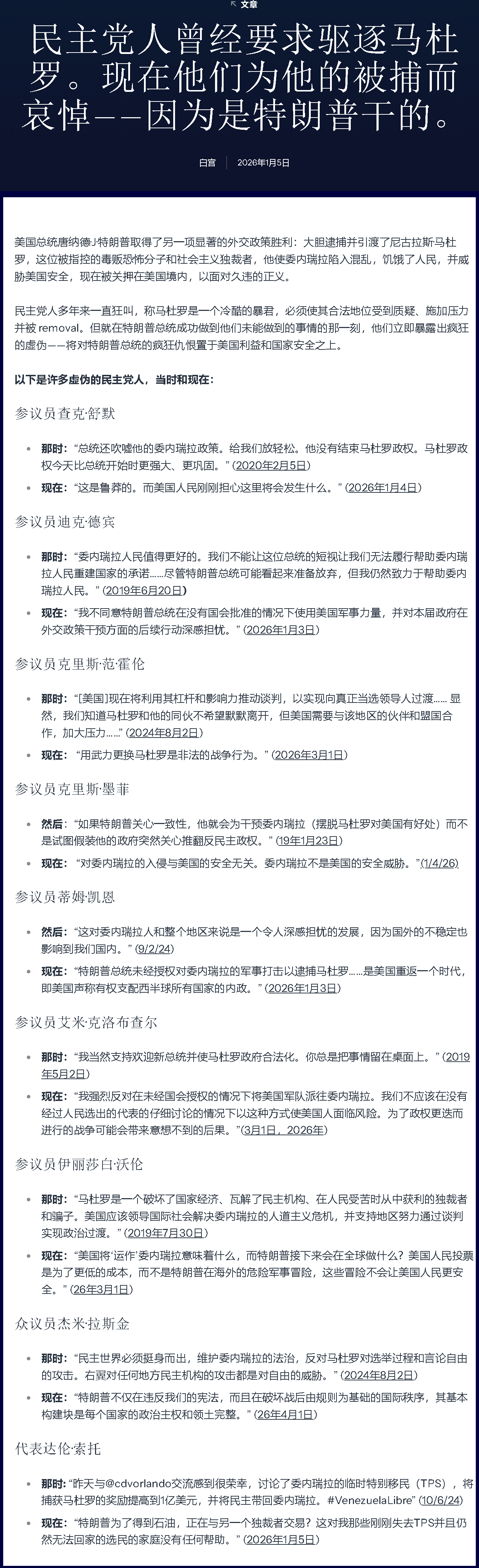 民主黨人多年來一直狂叫,稱馬杜羅是一個冷酷的暴君,必須使其合法地位受到質疑、施加壓力并被 removal。但就在特朗普總統成功做到他們未能做到的事情的那一刻,他們立即暴露出瘋狂的虛偽——將對特朗普總統的瘋狂仇恨置于美國利益和國家安全之上。