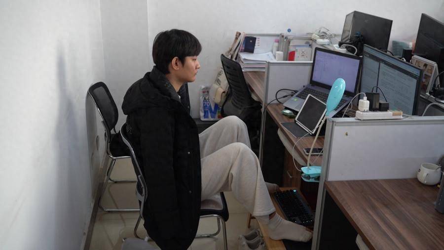 博三學生王海港正端坐電腦前,目光專注地凝視屏幕,腳趾靈活地在鍵盤上跳躍、在鼠標上挪動,一行行復雜的數學公式與量子仿真代碼隨之躍然屏上。