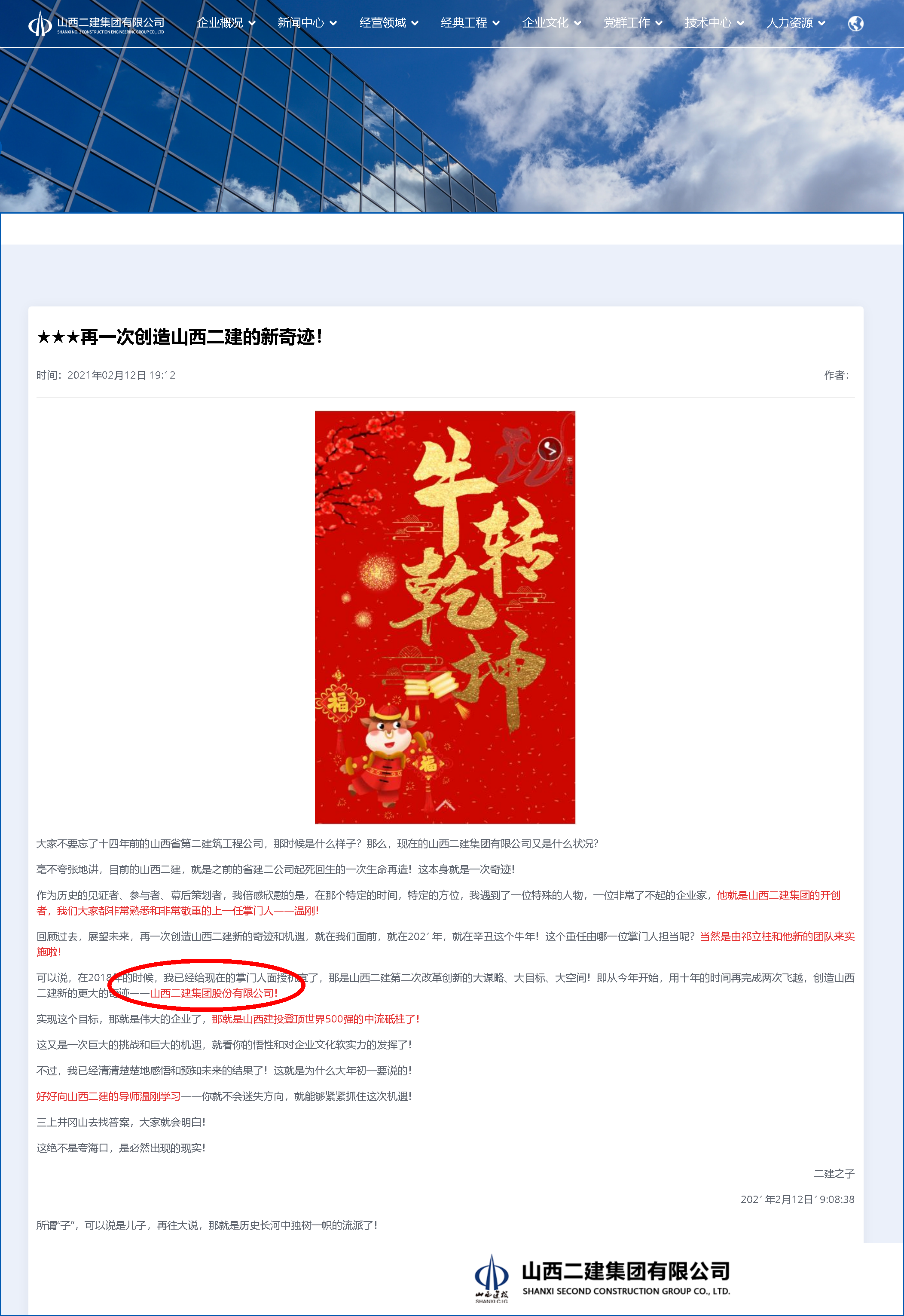 回顧過去,展望未來,再一次創(chuàng)造山西二建新的奇跡和機遇,就在我們面前,就在2021年,就在辛丑這個牛年!這個重任由哪一位掌門人擔當呢?當然是由祁立柱和他新的團隊來實施啦!