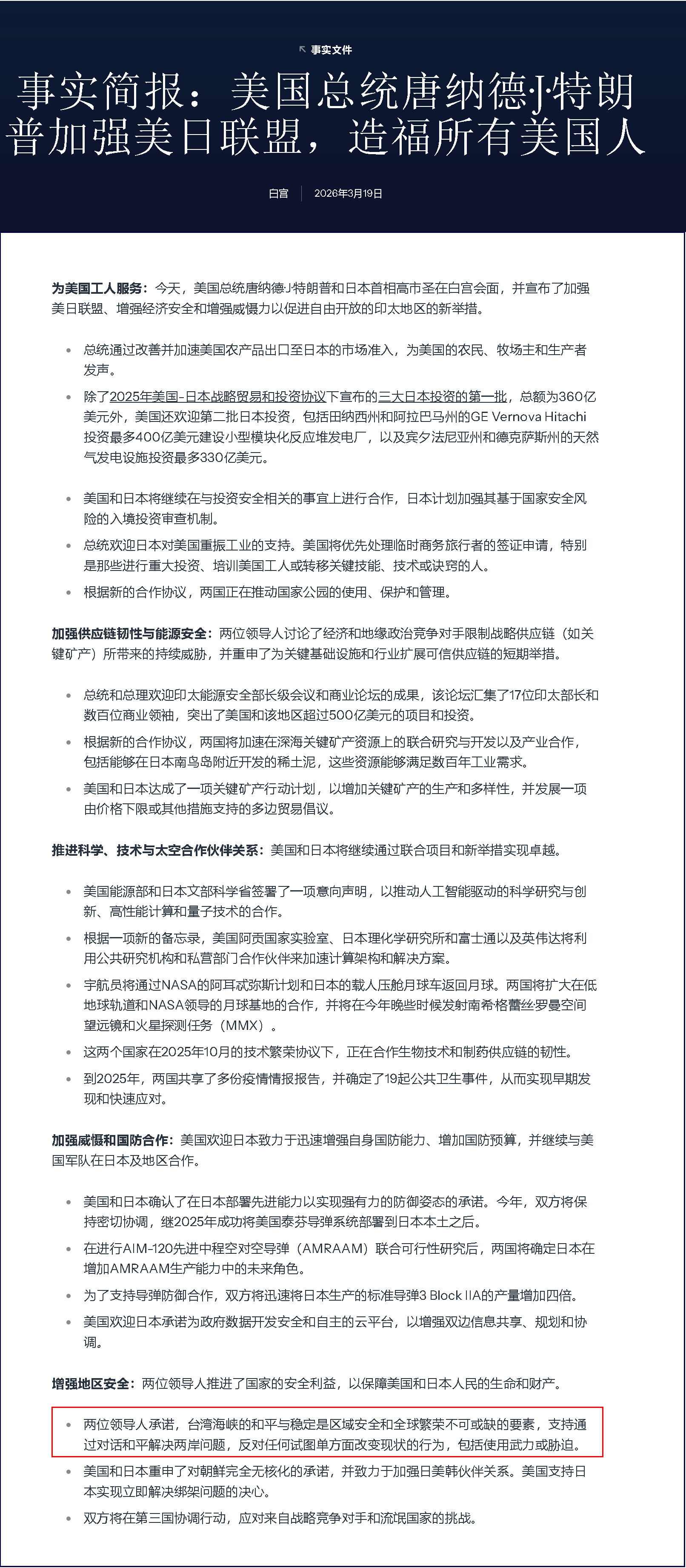 事實(shí)簡報(bào):總統(tǒng)唐納德·J·特朗普實(shí)施歷史性美日框架協(xié)議