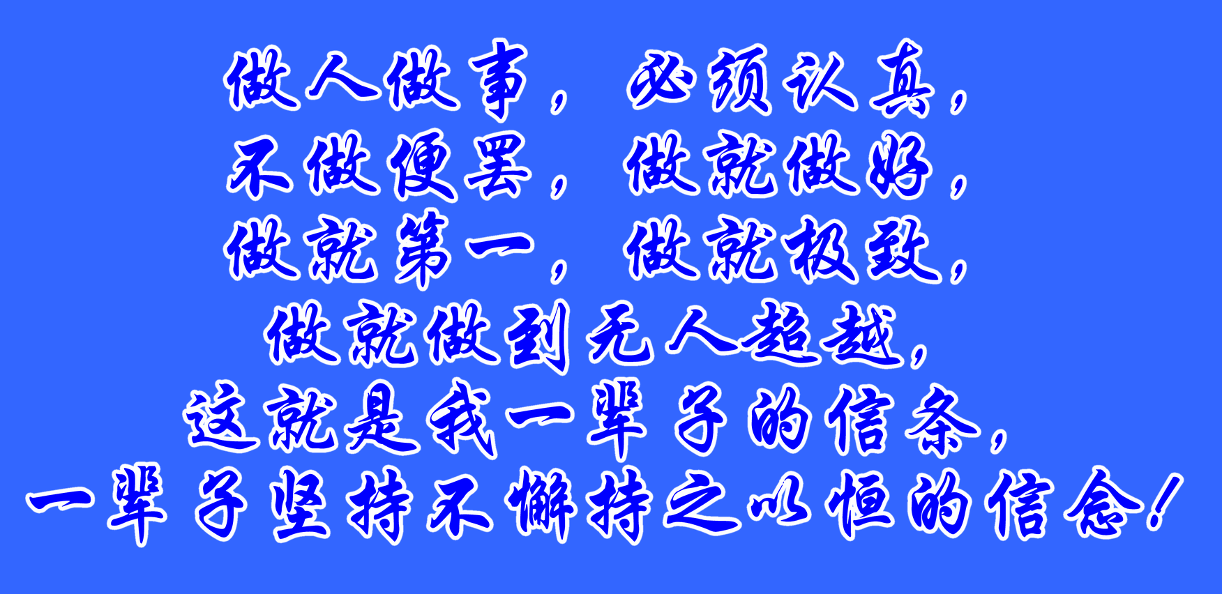 做人做事,必須認真,不做便罷,做就做好,做就第一,做就極致,做就做到無人超越,這就是我一輩子的信條,一輩子堅持不懈持之以恒的信念!可以說,七十年始終如一,不曾懈怠,年復一年,日復一日,修成正果,此生甚慰!我做到了人生無憾上天護佑的境界,做到了為人一世天地良心的高端,做到了道德和合一體的自然,感慨、欣慰、滿足!